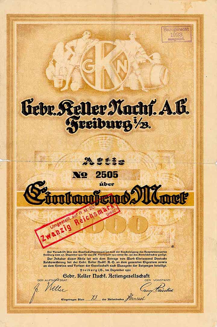 | Previous lot | Back | Next lot | | Lot: | 846 (Germany until 1945 (No Reichsbank)) | | Title: | Gebr. Keller Nachf. AG | | Details: | Aktie 1.000 Mark Dez. 1921 (Auflage 2600, R 10). | Starting price: | 500,00 EUR | Issuing- date: | 01.12.1921 | Issuing- place: | Freiburg i/B. | | Picture: |  | | Number: | 2505 | | Info: | Gegründet 1920 zur Übernahme und Fortführung des unter der Firma Gebr. Keller Nachf. in Freiburg betriebenen Unternehmens. Übernahme der Fabrikation von chemisch-technischen und pharmazeutischen Produkten sowie des Handels mit Spezialpräparaten. Ankauf von einschlägigen Patenten, Herstellungsverfahren und sonstigen Schutzrechten. Drogen-Grosshandlung. | | Specials: | Herrliche Gestaltung: Allegorien und diverse chemische Gerätschaften gruppiert um die Buchstaben GKN. | | Availability: | Knickfalten, Einriss der vertikalen Knickfalte. (R 10) | | Condition: | VF. | | Sold: | unsold |