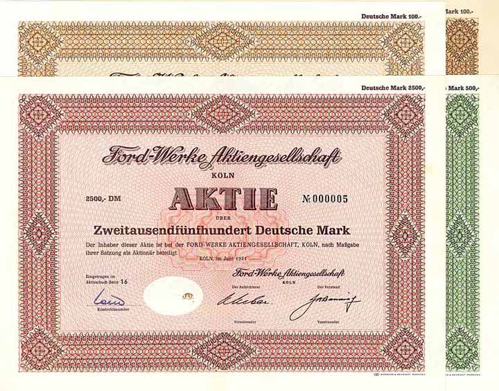 | Previous lot | Back | Next lot | | Lot: | 2049 (Deutschland 1948-Today (Die Deutsche Mark)) | | Title: | Ford-Werke AG (4 Stücke) | | Details: | Aktie 100 DM, #50582 Aug. 1950; 500 DM, #156 + 2.500 DM, #5 Juni 1971; 100 DM, #50888 Mai 1976. | Starting price: | 120,00 EUR | Issuing- place: | Köln | | Picture: |  | | Info: | Henry Ford baute 1896 sein erstes Automobil. 1903 gründete er in Detroit die Ford Motor Company. In den 20er Jahren besaß Ford in den USA einen Marktanteil von 50 % und expandierte kräftig in’s Ausland: 1925 wurde in Berlin die Ford Motor Company AG gegründet. Die Fabrik in Berlin-Plötzensee war zunächst ein reines Montagewerk. 1931 ging das noch heute bestehende Werk in Köln in Betrieb, dessen Grundstein Henry Ford persönlich gelegt hatte. 1939 wurde der heutige Firmenname angenommen: Ford-Werke AG. Nennenswerte Kriegsschäden (wen wundert’s?) erlitten ausgerechnet die Ford-Werke natürlich nicht, so daß bereits am 8.5.1945 die Produktion wieder aufgenommen werden konnte. Schon 1953 wurden vor allem dank des legendären Taunus 12 M alle früheren Produktionsrekorde eingestellt. Bis zum Squeeze-Out 2002 in Deutschland auch börsennotiert. | | Specials: | Alle lochentwertet. | | Condition: | UNC-EF. | | Sold: | 150,00 EUR |