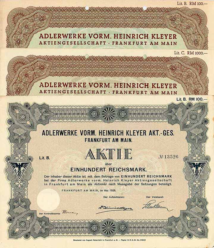 | Previous lot | Back | Next lot | | Lot: | 907 (Cars) | | Title: | Adlerwerke vorm. Heinrich Kleyer AG (3 Stücke) | | Details: | Aktie 1.000 RM Mai 1929, #13526, 100 RM Sept. 1942, blanco + 1.000 RM Sept. 1942, blanco. | Starting price: | 320,00 EUR | Issuing- place: | Frankfurt am Main | | Picture: |  | | Info: | Gegründet 1880 als Maschinen- und Velociped-Handlung von Kommerzienrat Dr.-Ing. h.c. Heinrich Kleyer, AG seit 1895. Die ab 1896 von Kleyer produzierten Schreibmaschinen waren gegenüber den bis dahin erhältlichen amerikanischen Modellen so weit verbessert, daß sie die Büros im Sturm eroberten. 1900 wurde mit dem Bau von Automobilen begonnen. Auch hier sind die Adlerwerke so erfolgreich, daß am Vorabend des 1. Weltkrieges jeder fünfte Motorwagen in Deutschland ein Adler war. In den 30er Jahren waren die Adlerwerke Pionier bei der Entwicklung strömungsgünstiger Karosserien (lange bevor es den cw-Wert gab). Noch in den 50er Jahren, als Adler groß in den Motorradbau eingestiegen war, gelangen Konstruktionen von solcher Qualität und Reife, daß sie von den Japanern noch 10 Jahre später detailgetreu kopiert wurden. 1980 Unternehmenspachtvertrag mit der Triumph Werke Nürnberg AG (die dabei in TRIUMPH-ADLER AG für Büro- und Informationstechnik umfirmierte; sie war 1896 als “Deutsche Triumph-Fahrradwerke” durch die englische Triumph Cycle Company Ltd. in Coventry gegründet worden, 1957 verkaufte die Dresdner Bank ihre Triumph-Aktienmehrheit an Max Grundig, seit 1985 TA Triumph-Adler AG, später eine reine Beteiligungsholding mit dem Puppenhersteller Zapf Creation AG als bekanntester Tochter). Die immer noch börsennotierte Adlerwerke vorm. Heinrich Kleyer AG, deren Großaktionäre erst zu über 90 % die Philipp Holzmann AG und später die HBAG Real Estate AG in Hamburg (heute nach Verschmelzung AGIV Real Estate AG; 50,29 %) und der schillernde Heidelberger Immobilienunternehmer Roland Ernst (48 %) waren, wurde 1999 umbenannt in “Adler Real Estate AG”. Aus dem stillgelegten Werk auf dem fast 200.000 qm großen Areal neben dem Frankfurter Hauptbahnhof wurde ein Gewerbepark. | | Condition: | EF-VF. | | Sold: | 320,00 EUR |
