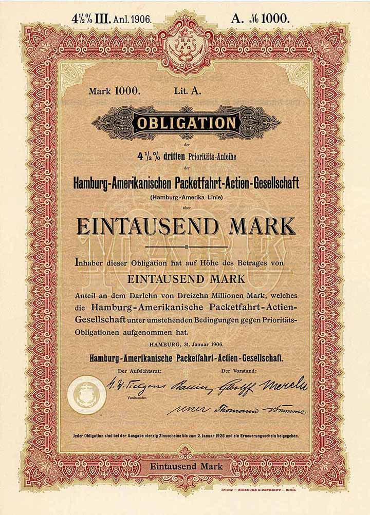 | Previous lot | Back | Next lot | | Lot: | 896 (Germany until 1945) | | Title: | Hamburg-Amerikanische Packetfahrt-AG | | Details: | 4,5 % Obl. 1.000 Mark 31.1.1906 (Teilblankette, R 10). | Starting price: | 200,00 EUR | Issuing- date: | 31.01.1906 | Issuing- place: | Hamburg | | Picture: |  | | Info: | Gründung 1847. Drei große Segler waren die ersten Fahrzeuge der Hamburg-Amerika-Linie, die aber bald durch Dampfschiffe ersetzt wurden. Ende des 19. Jh. war die Flotte auf über 40 Dampfer angewachsen. Befahren wurden die Linien von Hamburg nach New York, Baltimore, Philadelphia, Boston, Canada, New Orleans, von Stettin nach New York sowie von Italien nach New York und nach Argentinien. Verträge sicherten der HAPAG die Beförderung der deutschen, englischen, französischen, amerikanischen und italienischen Post über den Atlantik. Bis in die 1870er Jahre von eher nur regionaler Bedeutung, doch unter Albert Ballin (1857-1918), der 1899 Generaldirektor der HAPAG wurde, entstand ein Unternehmen von weltumspannender Bedeutung. Seine absolute Blütezeit erreichte es 1914 mit einer Flotte von 1.360.000 Bruttoregistertonnen, darunter mit den Dampfern "Imperator", "Vaterland" und "Bismarck" die größten Schiffe der Welt. Die Folgen des 1. Weltkrieges bedeuteten eine schwere Zäsur: Aufgrund des Versailler Vertrages musste die gesamte Flotte an die Entente-Staaten abgeliefert werden. Der Wiederaufbau war mühsam, erst mit der 1926 erfolgten Übernahme der Deutsch-Austral-, Kosmos- und Hugo-Stinnes-Linien kam die HAPAG wieder in die Reihe der größten Reedereien der Welt. 1930 kam mit dem Bremer Erzkonkurrenten, dem Norddeutschen Lloyd, ein Gemeinschaftsvertrag zustande, außerdem war die HAPAG Hauptvertreter der Deutschen Zeppelin-Reederei und Generalvertreter für die "Deutsche Lufthansa AG". 1970 Fusion von HAPAG und dem 1857 gegründeten Norddeutschen Lloyd zur heutigen Hapag-Lloyd AG. Nun eine Tochter der früheren Preussag (heute TUI), tätig in den Bereichen Seeschifffahrt, Transport, Seehafenbetriebe, Reisebüros, Flugtouristik. Erst 2005 wurde diese TUI-Sparte durch Kauf der CP-Ships (Schiffahrtssparte der Canadian Pacific Railway) noch einmal kräftig gestärkt. | | Availability: | Aus alter Sammlung. (R 10) | | Condition: | EF. | | Sold: | 220,00 EUR |