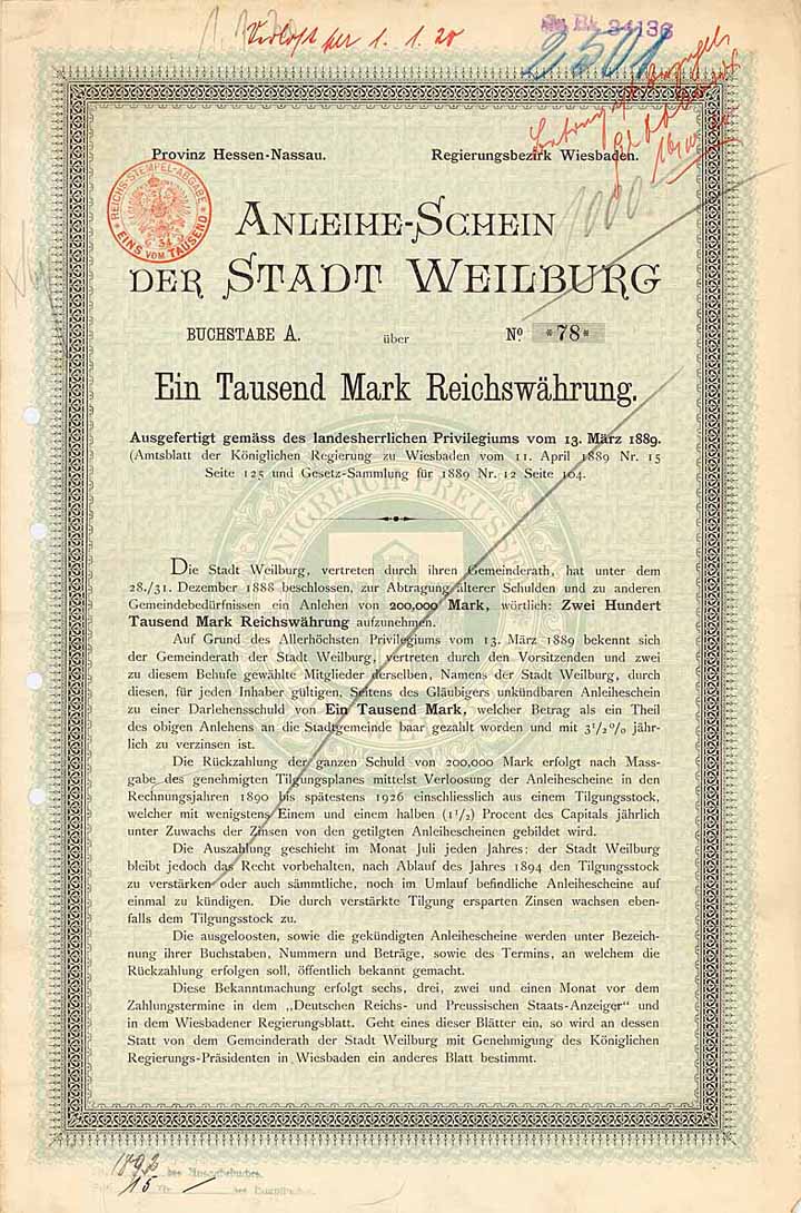 | Previous lot | Back | Next lot | | Lot: | 1111 (Germany until 1945) | | Title: | Stadt Weilburg | | Details: | 3,5 % Anleihe-Schein 1.000 Mark 1.7.1889 (Auflage 150, R 8). | Starting price: | 120,00 EUR | Issuing- date: | 01.07.1889 | Issuing- place: | Weilburg | | Picture: |  | | Number: | 78 | | Info: | Ehemalige Residenzstadt im Landkreis Limburg-Weilburg und des Landes Hessen. Heute ein Luftkurort. | | Specials: | Teil einer Anleihe in Höhe von 200.000 Mark zur Abtragung älterer Schulden und anderen Gemeindebedürfnissen. | | Availability: | 13 Stücke wurden 2014 gefunden. Nur 6 Stück in guter Erhaltung, 7 weitere sind beschnitten! Doppelblatt mit Kupons, Abheftlochungen. (R 8) | | Condition: | VF. | | Sold: | unsold |