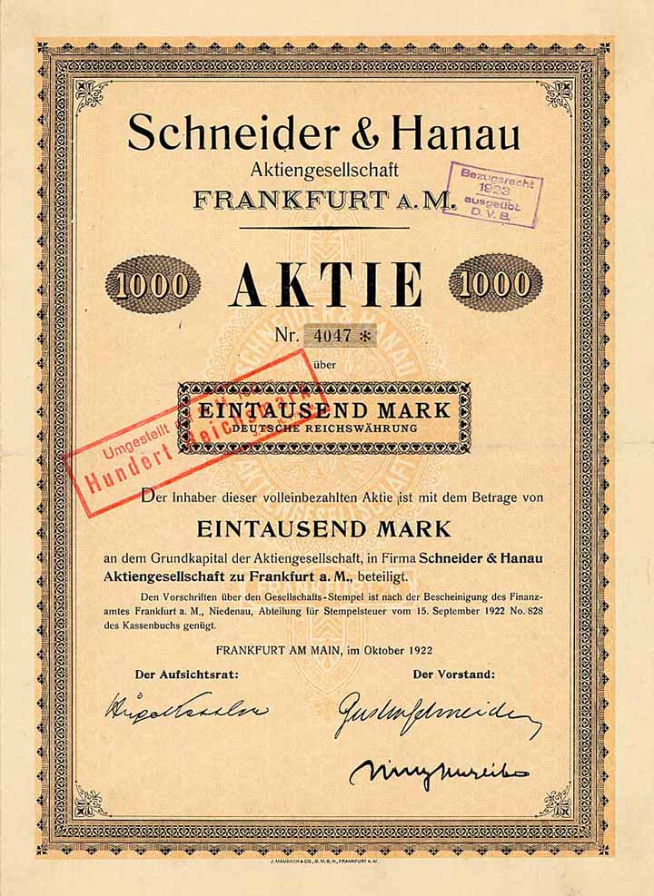 | Previous lot | Back | Next lot | | Lot: | 1089 (Germany until 1945) | | Title: | Schneider & Hanau AG | | Details: | Aktie 1.000 Mark Okt. 1922 (Auflage 2500, R 10). | Starting price: | 90,00 EUR | Issuing- date: | 01.10.1922 | Issuing- place: | Frankfurt a.M. | | Picture: |  | | Number: | 4047 | | Info: | Gründung 1899 als Kunstgewerbliche Werkstätten vorm. Schneider & Hanau. Ab 1900 Schneider & Hanau AG. Möbelfabrik und Ausstattungsgeschäft (Kaiserstr. 12, Fischerfelderstr. 13 und Hinter der Schönen Aussicht 8), außerdem Handel mit Kunstgegenständen und Antiquitäten. Börsennotiz Frankfurt. 1931 Beschluss der Liquidation. | | Availability: | Doppelblatt, mit beiliegenden Restkupons. (R 10) | | Condition: | EF-VF. | | Sold: | 90,00 EUR n |