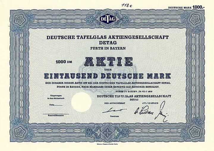 | Previous lot | Back | Next lot | | Lot: | 1274 (Deutschland 1948-Today (Die Deutsche Mark)) | | Title: | Deutsche Tafelglas AG (Detag) | | Details: | Aktie 1.000 DM Juli 1960 (Muster, R 10). | Starting price: | 100,00 EUR | Issuing- date: | 01.07.1960 | Issuing- place: | Fürth (Bayern) | | Picture: |  | | Info: | Gründung 1899 unter Übernahme der Glasfabrik Weiden AG vorm. Ed. Kupfer, noch im gleichen Jahr Umfirmierung in “Tafel-, Salin- und Spiegelglasfabriken AG”, Fürth (Bay.), 1932 Umfirmierung wie oben. 1927 im Werk Weiden Errichtung einer modernen Ziehanlage System “Fourcault” für Fensterglas. 1929 erlangte der Verein Deutscher Spiegelglasfabriken in Köln die Aktienmehrheit, scheinbar dadurch beeinflußt 1929/30 Verkauf der Glasfabrik Mitterteich an die Deutsche Spiegelglas AG, Grünenplan/Hann. 1932 Ankauf der Glasfabrik Crengeldanz AG in Witten (Ruhr) von der Gelsenkirchener Bergwerks-AG, welche 1932 ebenso wie die Gewerkschaft Kunzendorfer Werke (Niederlausitz) auf die Deutsche Tafelglas AG verschmolzen wurde. Im gleichen Jahr auch Übernahme der Vopelius’schen und Wentzel’schen Glashütten GmbH, Sulzbach (Saar). 1949 kam zu den drei Werken Fürth, Weiden und Witten aus dem Besitz der SIGLA GmbH, Wernberg (Opf.) eine Fabrik für Sicherheitsglas hinzu. Peu á peu erwarb die ehemalige Bergwerksgesellschaft Dahlbusch in Gelsenkirchen (heute Dahlbusch Verwaltungs-AG) die Aktienmehrheit, an Dahlbusch seinerseits erwarb die britische Pilkington Brothers Ltd. die Majorität. 1970 Übernahme der Deutsche Libbey-Owens-Gesellschaft für maschinelle Glasherstellung AG (DELOG) in Gelsenkirchen und Umfirmierung in “Flachglas AG DELOG-DETAG”. Die Pilkington-Flachglas-Gruppe war nun mit über 40.000 Beschäftigten der Welt größter Glasproduzent. 2000 Umfirmierung in “Pilkington Deutschland AG” und Sitzverlegung nach Gelsenkirchen. Das Spruchstellenverfahren zur Abfindung der wenigen verbliebenen freien Aktionäre zieht sich inzwischen fast 20 Jahre hin. | | Specials: | Firmensignet “DETAG” in der Umrandung. | | Availability: | Belegstück der Frankfurter Börse handschriftlich numeriert (#118c). Rückseitig Klebereste. Muster-perforiert. (R 10) | | Condition: | EF-VF. | | Sold: | 110,00 EUR |