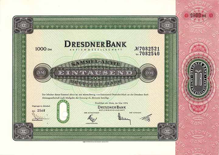 | Previous lot | Back | Next lot | | Lot: | 1296 (Deutschland 1948-Today (Die Deutsche Mark)) | | Title: | Dresdner Bank AG | | Details: | Aktie 1.000 DM Mai 1974. | Starting price: | 75,00 EUR | Issuing- date: | 01.05.1974 | Issuing- place: | Frankfurt a. M. | | Picture: |  | | Number: | 7082521-540 | | Info: | Gründung 1872 unter Übernahme des altangesehenen Bankgeschäfts von Michael Kaskel in Dresden. 1881 Errichtung einer Niederlassung in Berlin, wohin 1884 auch die Geschäftsleitung verlegt wurde. Verstärkt nach der Jahrhundertwende schlug die Dresdner Bank, wie die anderen Großbanken auch, einen atemberaubenden Expansionskurs durch massenhafte Übernahme kleinerer Regional- und Privatbanken ein. 1931 in der Weltwirtschaftskrise musste die Dresdner Bank vom Deutschen Reich gerettet werden, das daraufhin (teils über die Deutsche Golddiskontbank) Mehrheitsaktionär wurde. Die de facto verstaatlichte Dresdner Bank nahm anschließend durch Fusion die berühmt-berüchtigte Darmstädter und Nationalbank auf, deren Zusammenbruch der Auslöser der Krise gewesen war. 1937 gab das Reich seine Mehrheitsbeteiligung an der inzwischen stabilisierten Bank wieder ab. Nach dem 2. Weltkrieg wurde die Dresdner Bank von den Alliierten zunächst zerschlagen: durch Ausgründung gingen die süddeutschen Geschäfte auf die Rhein-Main Bank über, die norddeutschen auf die Hamburger Kreditbank und die nordrhein-westfälischen auf die Rhein-Ruhr-Bank. Diese drei Institute fusionierten 1957 zur (neuen) Dresdner Bank AG. Dazu erhielten die Aktionäre 1952 “Restquoten” genannte Reichsmark-Aktien der bestehen bleibenden “Altbank”, der die seinerzeit nicht realisierbaren Ost-Ansprüche verblieben. 2001 mit hochfliegenden Allfinanz-Plänen von der Allianz-Versicherung übernommen, 2008/09 dann an die Commerzbank verkauft worden und mit dieser fusioniert. | | Availability: | Entwertet. | | Condition: | UNC-EF. | | Sold: | unsold |