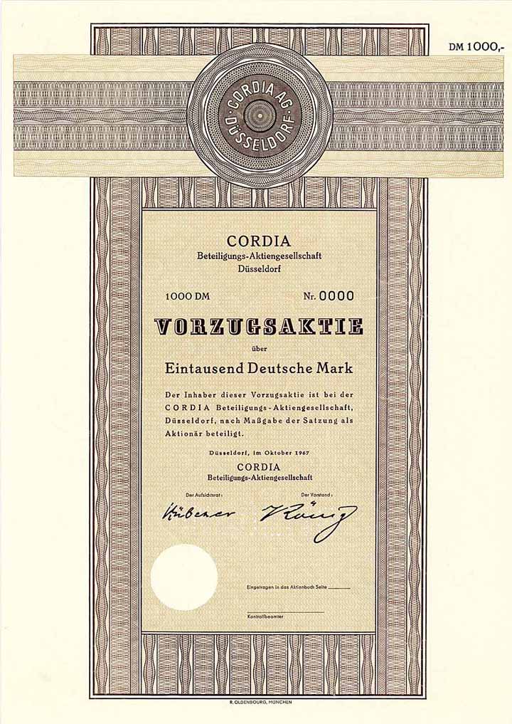 | Previous lot | Back | Next lot | | Lot: | 1251 (Deutschland 1948-Today (Die Deutsche Mark)) | | Title: | Cordia Beteiligungs-AG | | Details: | VZ-Aktie 1.000 DM Okt. 1967 (nullgeziffertes Muster, R 10). | Starting price: | 80,00 EUR | Issuing- date: | 01.10.1967 | Issuing- place: | Düsseldorf | | Picture: |  | | Info: | Gegründet 1959. Zweck: Der Erwerb und die Verwaltung von Vermögensbeteiligungen, die Beteiligung an anderen Unternehmen und die Durchführung aller damit in Zusammenhang stehenden Geschäfte. | | Availability: | Ungültig-perforiert. (R 10) | | Condition: | UNC-EF. | | Sold: | unsold |