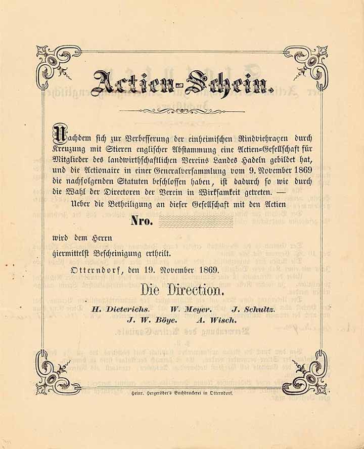 | Previous lot | Back | Next lot | | Lot: | 708 (Germany until 1945) | | Title: | AG zur Anfertigung englischer Zuchtstiere | | Details: | Actien-Schein 19.11.1869 (Blankette, R 10). | Starting price: | 150,00 EUR | Issuing- date: | 19.11.1869 | Issuing- place: | Otterndorf | | Picture: |  | | Info: | Die AG wurde 1875 gegründet und bezweckte die Verbesserung der einheimischen Rindviehrasse durch Kreuzung mit englischen Stieren (Shorthorn mit Pedegree). Als englische Stiere wurden auch solche dieser Rasse verstanden, welche nicht in England gezüchtet oder gekauft worden sind. Wirkungskreis der Ges. umfasste das Gebiet der Gemeinden Bülkau, Kehdingbruch und Cadenberge. Die Bedeckunsstation war etabliert in Sprenge. | | Specials: | Ein ganz außergewöhnliches Stück aus der Viehwirtschaft. | | Availability: | Innen mit handschriftlichen Ergänzungen. (R 10) | | Condition: | EF-VF. | | Sold: | unsold |