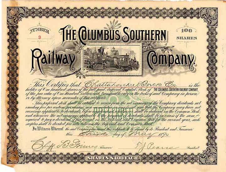| Previous lot | Back | Next lot | | Lot: | 57 (U.S.A.) | | Title: | Columbus Southern Railway | | Details: | 100 pref. shares à 100 $ 3.5.1890. | Starting price: | 180,00 EUR | Issuing- date: | 03.05.1890 | Issuing- place: | Georgia | | Picture: |  | | Number: | 9 | | Info: | Gründung 1887. Die 88 Meilen lange Bahn von Columbus nach Albany in Georgia wurde im März 1890 eröffnet, die Betriebsführung hatte die Georgia Midland & Gulf RR., an die die Columbus Southern auch für ganz kurze Zeit verpachtet war, ehe sie wieder eigenständig fuhr. 1895 in Finanzprobleme gekommen, 1896 nebst drei weiteren Bahnen an die gerade neu gegründete Georgia & Alabama RR verkauft. Diese wurde 1900 Teil des Seaboard Air Line-Systems. Sollten Sie jemals nach Columbus, Georgia kommen (was dem Verfasser dieser Zeilen vor etlichen Jahren widerfuhr), achten Sie am Straßenrand auf das Reklameschild eines Gebrauchtwagenhändlers: „The crisis of today is the joke of tomorrow.“ Die Krise von heute ist morgen nur noch eine Anekdote. Wozu seitenweise über die Finanzmärkte und ihre Kapriolen schreiben - dieser eine Satz bringt es mehr als auf den Punkt. | | Specials: | Hochdekorativ gestaltetes Stück mit feiner Eisenbahnvignette. | | Availability: | Äußerst selten, bei uns letztmals 2012 einmal versteigert worden. | | Condition: | VF. | | Sold: | 180,00 EUR |