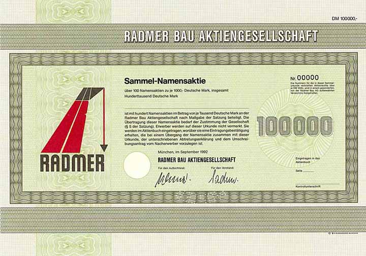 | Previous lot | Back | Next lot | | Lot: | 1762 (Deutschland 1948-Today (Die Deutsche Mark)) | | Title: | Radmer Bau AG | | Details: | Sammel-Namensaktie 100 x 1.000 DM Sept. 1992 (nullgeziffertes Muster, R 10). | Starting price: | 100,00 EUR | Issuing- date: | 01.09.1992 | Issuing- place: | München | | Picture: |  | | Info: | Gründung 1964 als “Bau und Beton KGaA”, 1975 Umfirmierung in “Wilhelm Radmer Bau und Beton AG”, 1984 Umfirmierung wie Wilhelm Radmer Bau AG, 1990 erneute Umfirmierung in Wilhelm Radmer Verwaltung AG (der baubezogene Bereich wurde dann von der neugegründeten Radmer Bau AG weitergeführt). Seitdem nur noch Verwaltung eigener Immobilien, vor allem in München. | | Availability: | Mit Kupons. Muster-perforiert. | | Condition: | UNC-EF. | | Sold: | 100,00 EUR n |