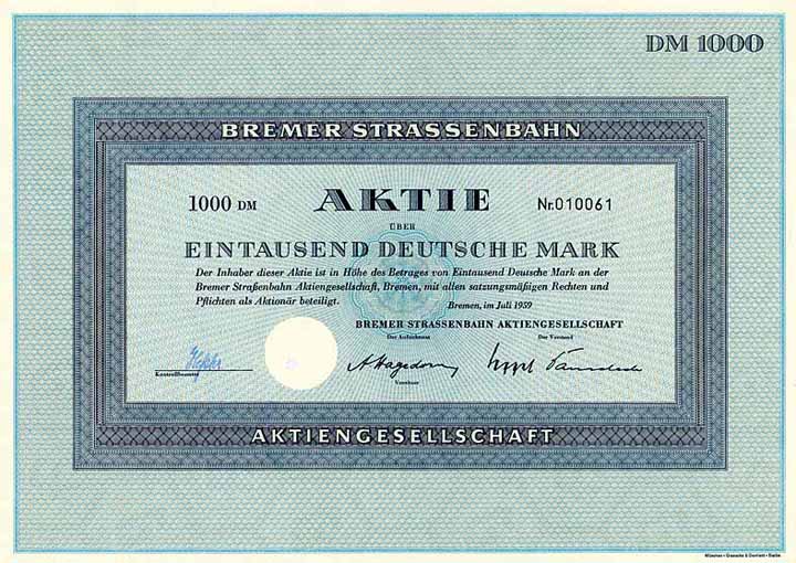 | Previous lot | Back | Next lot | | Lot: | 1476 (Deutschland 1948-Today (Die Deutsche Mark)) | | Title: | Bremer Strassenbahn AG | | Details: | Aktie 1.000 DM Juli 1959 (Auflage 5000, R 8). | Starting price: | 60,00 EUR | Issuing- date: | 01.07.1959 | Issuing- place: | Bremen | | Picture: |  | | Number: | 10186 | | Info: | Eröffnung der Bremer Pferdebahn 1876, elektrischer Betrieb ab 1.5.1892. Normalspurige Strecken von zusammen 67 km Länge. Noch heute als Bremer Strassenbahn AG börsennotiert. | | Availability: | Lochentwertet. (R 8) | | Condition: | EF. | | Sold: | 60,00 EUR |