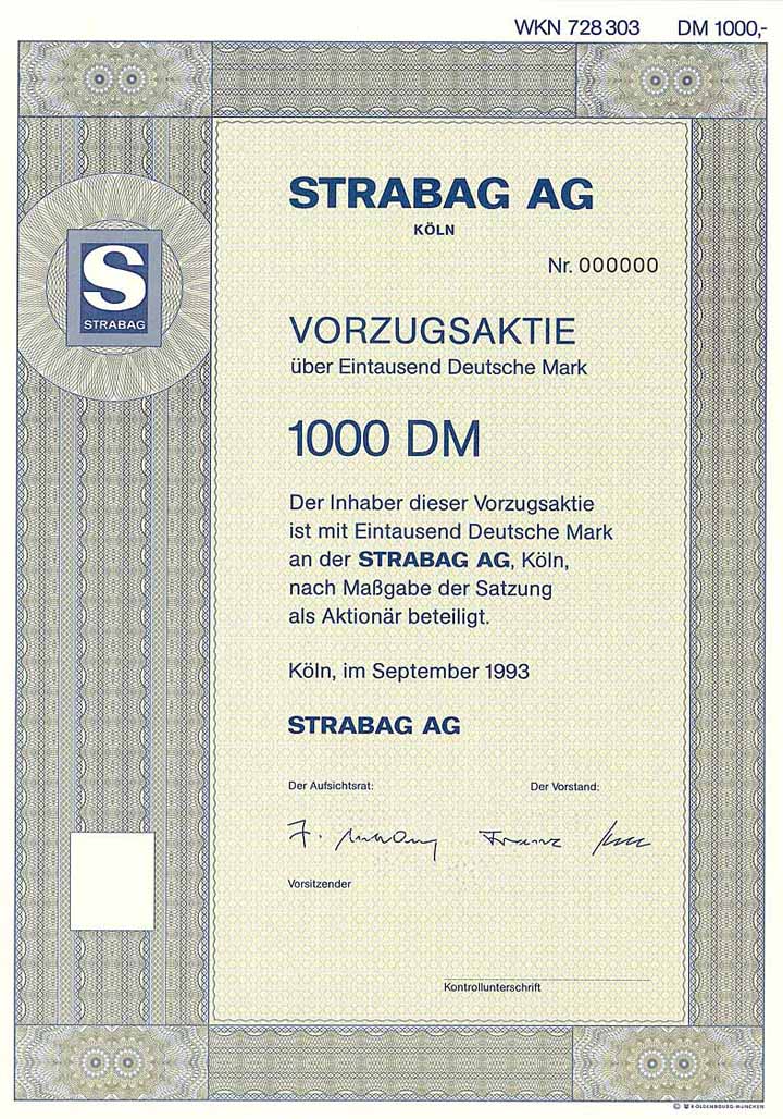 | Previous lot | Back | Next lot | | Lot: | 1404 (Deutschland 1948-Today (Die Deutsche Mark)) | | Title: | Strabag AG | | Details: | VZ-Aktie 1.000 DM Sept. 1993 (nullgeziffertes Muster, R 10). | Starting price: | 90,00 EUR | Issuing- date: | 01.09.1993 | Issuing- place: | Köln | | Picture: |  | | Info: | Keimzelle ist die 1895 gegründete „Straßenwalzenbetrieb vorm. H. Reifenrath GmbH“, aus der 1923 die Straßenbau-AG in Niederlahnstein bei Koblenz wurde. 1930 erstmaliger Auftritt als „Strabag“, 1931 Gründung der „Deutsche Teer- und Asphalt-Schotter AG“ (DEUTAG). 1835 wurde die Ilbau in Spittal/Drau, Österr., 1972 Umwandlung in ILBAU-AG. 1987 Gründung der BAU Holding AG als Holdinggesellschaft der ILBAU. 1949 Umfirmierung der deutsche Firma in Strabag-Bau AG und Sitzverlegung nach Köln, zugleich erstmals börsennotiert. 1952 Einstieg in den Hoch- und Ingenieurbau, ab 1955 auch im außereuropäischen Ausland aktiv. 1969 Übernahme der A.H.I. Bau Allgemeine Hoch- und Ingenieurbau AG, Düsseldorf. 1993 erneute Umfirmierung in STRABAG AG. 1997 Übernahme der Aktienmehrheit (die jahrzehntelang bei der Neusser Werhahn-Gruppe gelegen hatte) durch die Mehrheitsaktionärin der österreichischen BAUHOLDING AG. 2000 wird der Marktauftritt des österreichischen und des deutschen Teilkonzerns weltweit unter STRABAG vereinheitlicht. 2005 Erwerb von HEILIT + WOERNER und DYWIDAG aus der Insolvenz des Walter-Bau-Konzerns. Noch heute einer der größten deutschen Baukonzerne. | | Availability: | Muster-perforiert, mit Kuponbogen. (R 10) | | Condition: | UNC-EF. | | Sold: | unsold |