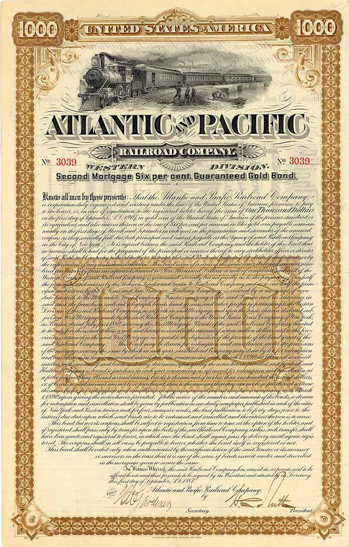 | Previous lot | Back | Next lot | | Lot: | 1636 (USA) | | Title: | Atlantic & Pacific Railroad Co. (Western Division) | | Details: | 6 % Mortgage Gold Bond 1.000 $ 1.9.1887. | Starting price: | 150,00 EUR | Issuing- date: | 01.09.1887 | | Picture: |  | | Number: | 3039 | | Info: | 1853 gegründet mit einem für die damalige Zeit eigentlich unvorstellbaren Kapital von 100 Mio. $. Gebaut wurden anfangs nur zwei kleine Strecken: von Franklin (später Pacific) nach Dillon (71 Meilen, fertig 1860) und Rolla (6 Meilen, fertig 1861). Neu konzessioniert 1866 durch einen “Act of Congress” für den Bau einer 2.000 Meilen langen Bahn von Springfield, Missouri zum Pazifik parallel zum 35. Breitengrad. Die US-Bundesregierung unterstützte den Bahnbau mit umfangreichen Landschenkungen unter der Bedingung, daß die Bahn bis 1878 fertig sein sollte. Fertiggestellt wurde im Osten der Abschnitt von St. Louis, Mo. nach Tulsa, Okla. und im Westen eine Strecke von Albuquerque, New Mexico nach Südkalifornien. Das dazwischenliegende Stück wurde nie vollendet. 1897 in der St. Louis & San Francisco Railway (Central Division) bzw. der Santa Fe Pacific Railway (Western Division) aufgegangen - die dann am Ende wieder gemeinsam bei der heutigen Burlington Northern Santa Fe landeten. | | Specials: | Für Kapital und Zinsen übernahmen die Atchison, Topeka & Santa Fe RR und die St. Louis & San Francisco Ry. je hälftig die Garantie. Meisterhafter Stahlstich der ABNC mit herrlicher Eisenbahnvignette. | | Availability: | Unentwertet, Kupons ab 1894 anhängend. Als Bond der „Western Division“ bei uns erstmalsüberhaupt angeboten. | | Condition: | EF | | Sold: | unsold |