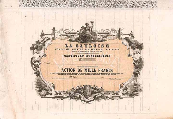 | Previous lot | Back | Next lot | | Lot: | 75 (Frankreich) | | Title: | La Gauloise Cie. Anonyme d’Assurances Maritimes | | Details: | Action (Certificat d’Inscription) 1.000 F von 1862 (Probedruck in ocker der Gründeraktie). | Starting price: | 100,00 EUR | Issuing- date: | 01.01.1862 | Issuing- place: | Le Havre | | Picture: |  | | Info: | Gründung am 25.1.1862 in der nach Marseille größten Hafenstadt Frankreichs, Le Havre. Die Schiffahrtsversicherung mußte im Jahre 1898 saniert werden. Im gleichen Jahr Neugründung als La Gauloise S.A. d'Assurances et de Réassurances. | | Specials: | Großformatiges Papier, wunderschön von Emile Eugène Lesaché illustriertes Papier mit Segelschiffen, weiblicher Allegorie mit Hahn zu ihren Füssen, Fässern und Kisten, unten Wappen mit lateinischem Spruch “Nutrisco et Extinguo”. Der bekannte Zeichner, Kupferstecher und Aquarellist Lesaché arbeitete hauptsächlich als Gestalter von Briefköpfen und Einladungskarten im Atelier von Le Magasins de Graveur Stern. Doppelblatt. Als ungültig per Stempelaufdruck und Perforation gekennzeichnet. Gedruckt in ocker/schwarz mit aufwendigem Sicherheitsmuster. | | Availability: | Einzelstück aus einem uralten Druckereiarchiv. | | Condition: | VF | | Sold: | unsold |