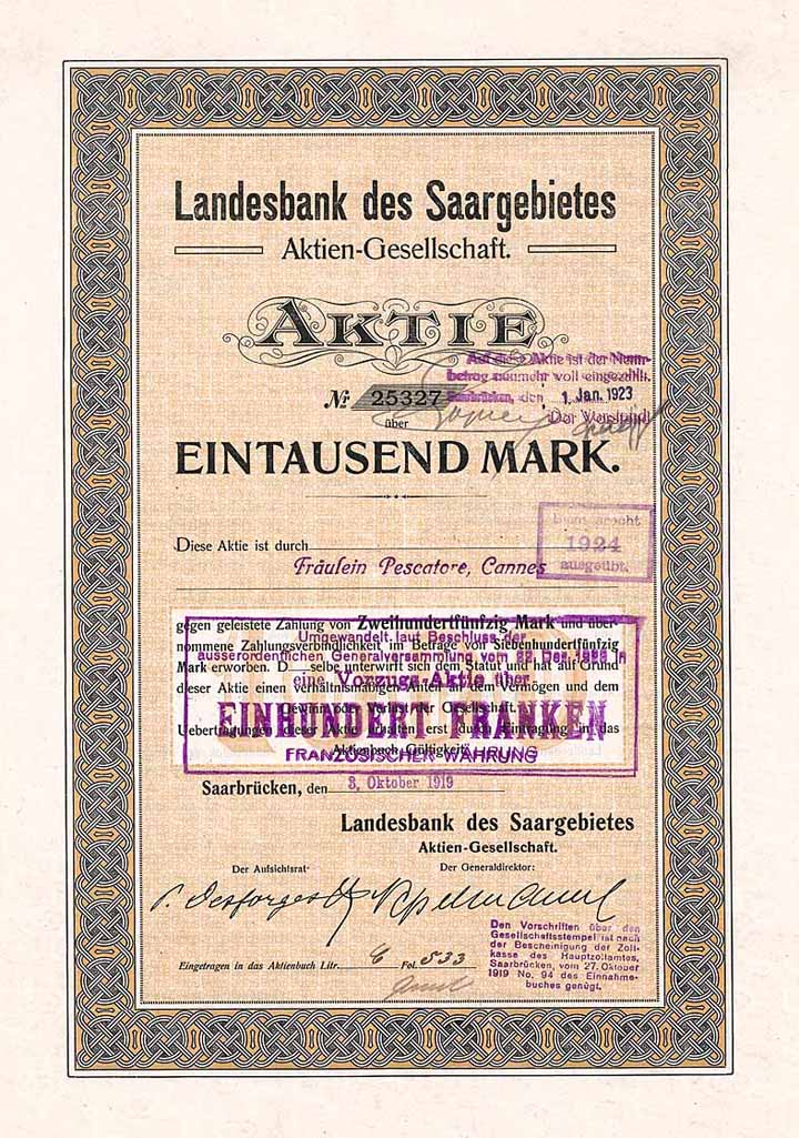 | Previous lot | Back | Next lot | | Lot: | 1301 (Germany until 1945) | | Title: | Landesbank des Saargebietes AG | | Details: | Namensaktie 1.000 Mark 3.10.1919. Gründeraktie (Auflage 30000, R 9). | Starting price: | 150,00 EUR | Issuing- date: | 03.10.1919 | Issuing- place: | Saarbrücken | | Picture: |  | | Number: | 26375 | | Info: | Gründung 1919 als Reaktion auf die veränderten Machtverhältnisse im Saarland nach Ende des 1. Weltkrieges durch deutsche und französische Bankiers und Industrielle unter Führung der Société Nancéienne de Crédit Industriel et de Depots, Nancy, die auch Mehrheitsaktionär war. Neben dem Hauptsitz in Saarbrücken, Kaiserstr. 44 bestanden Filialen in Saarlouis, St. Ingbert, Dillingen, Merzig, Völklingen, Ottweiler und Neunkirchen. Nachdem das Saarland „heim in‘s Reich“ geholt worden war, ging die Landesbank 1935 „in Folge der veränderten politischen Verhältnisse“ in Liquidation. Einlagen und weitere Bilanzpositionen wurden von der DRESDNER BANK übernommen. | | Specials: | Ausgestellt auf die Société Nancéienne de Crédit Industriel et de Depots, Nancy. 1923 in eine Vorzugsaktie zu 100 Franken umgewandelt. | | Availability: | NICHT lochentwertet. (R 9) | | Condition: | EF-. | | Sold: | 150,00 EUR |