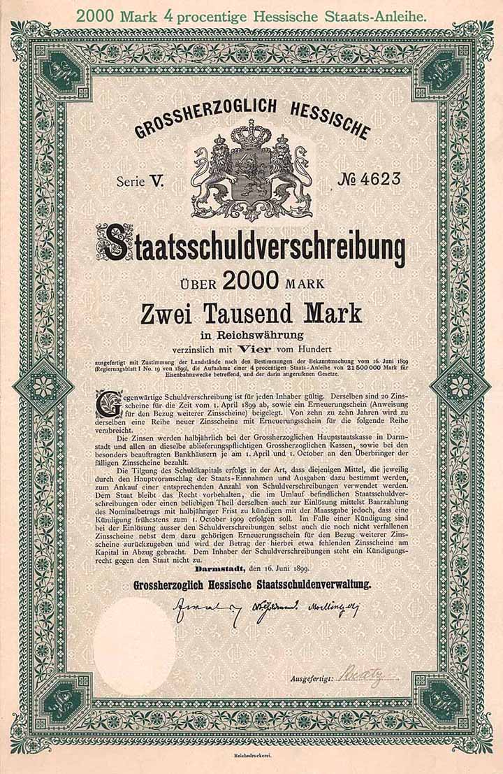 | Previous lot | Back | Next lot | | Lot: | 1271 (Germany until 1945) | | Title: | Grossherzogtum Hessen (V. Anleihe für Eisenbahnzwecke) | | Details: | 4 % Schuldv. 2.000 Mark 16.6.1899 (R 9). | Starting price: | 75,00 EUR | Issuing- date: | 16.06.1899 | Issuing- place: | Darmstadt | | Picture: |  | | Number: | 2877 | | Info: | Eine mit Zustimmung der Landstände begebene Anleihe von 21,5 Mio. Mark für Eisenbahnzwecke. Nach Gründung der preußisch-hessischen Eisenbahngesellschaft und der 1896 in diesem Zusammenhang erfolgten Verstaatlichung der Hessischen Ludwigs-Eisenbahn (zu der Zeit die größte noch bestehende Privatbahn in Deutschland) war nun auch in Hessen das Prinzip der Staatseisenbahn umfassend durchgesetzt, entsprechende Investitionsmittel wurden über Anleihen beschafft. | | Specials: | Hübscher Druck der Reichsdruckerei mit Rankwerk-Umrahmung und großem Prunkwappen. | | Availability: | Nur sieben Stück wurden 2007 im “Züricher Anleihen-Schatz” gefunden. Doppelblatt, mit Kupons. (R 9) | | Condition: | EF. | | Sold: | 120,00 EUR |