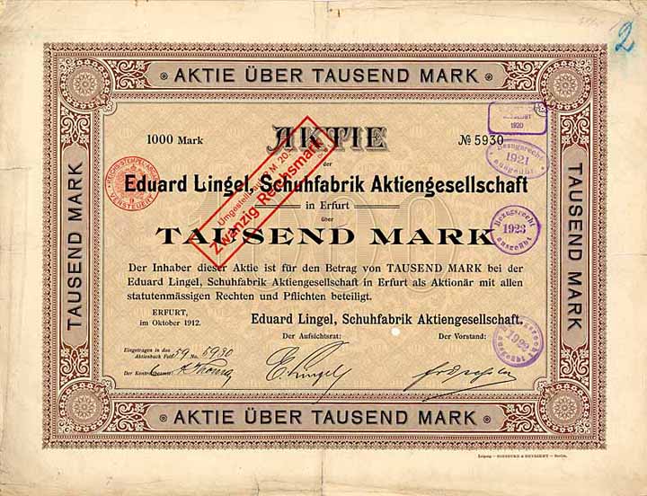 | Previous lot | Back | Next lot | | Lot: | 451 (Germany until 1945) | | Title: | Eduard Lingel Schuhfabrik AG | | Details: | Aktie 1.000 Mark Okt. 1912 (Auflage 2000, R 10), 1925 umgestellt auf 20 RM, 1933 eigentlich durch Neudrucke ersetzt. | Starting price: | 200,00 EUR | Issuing- date: | 01.10.1912 | Issuing- place: | Erfurt | | Picture: |  | | Number: | 5930 | | Info: | Georg Michael Eduard Lingel (* 1849 in Königsberg in Bayern, + 1922 in Hamburg) machte eine Kaufmannslehre in einem Barmer Textilbetrieb, lernte drei Fremdsprachen und beschloss im Alter von 23 Jahren, Unternehmer zu werden. Im Haus “Zum Krummen Hecht” am Fischersand 9 in der Erfurter Altstadt nahm Lingel 1872 mit 5 Arbeitern die Schuhproduktion auf. Ganze 36 Paar Zeugstiefel schaffte er damals am Tag. Nur zwei Jahre später stellte Lingel statt Zeugstiefeln jetzt Lederstiefel her, beschäftigte bald 300 Arbeiter und kaufte für den stark gewachsenen Betrieb das Haus Herrmannsplatz 5. 1877/78 sandte Lingel eine Delegation in die USA, um die dortigen Fertigungsmethoden zu studieren, anschließend stellte er seinen Betrieb von Handarbeit auf mechanische Schuhfabrikation um. Bald gingen große Exportaufträge aus Schweden, Holland sowie Nord- und Südamerika ein. 1887 zerstörte ein Feuer die Fabrik, die aber sofort mit einer Vergrößerung auf 50.000 qm Produktionsfläche in der Landgrafenstr. 1 wieder aufgebaut wurde. Lingel war jetzt vor allem bekannt für rahmengenähte Herrenschuhwaren, eine Spezialität waren Dr. Lahmanns Gesundheitsstiefel. 1898 wandelte Lingel die Firma in eine AG um und zog sich zu Beginn des 1. Weltkrieges aus der Leitung zurück, nachdem kriegsbedingt jede Kreativität verschwand und die Fabrik statt dessen nur noch Militärstiefel produzierte. Nach Aufhebung der Zwangswirtschaft 1919 ließ sich der Weltruf der Lingel-Schuhe wieder herstellen, zudem konnten 1920 auch noch die lokalen Wettbewerber Mella Schuhfabrik und Friedrich Metzler übernommen werden. Dies begleitete Eduard Lingel als AR-Vorsitzender noch bis zu seinem Tod 1922. Mit 2000 Mitarbeitern produzierte die Firma jetzt 2 Mio. Paar Schuhe im Jahr und war EINE DER BEDEUTENDSTEN SCHUHFABRIKEN in ganz Deutschland. 1929 Aufbau eines eigenen Vertriebs mit 46 Verkaufsstellen im ganzen Reich. Großaktionär der in Leipzig, bis 1933 auch in Berlin und Frankfurt/Main börsennotierten AG war inzwischen das Bankhaus Adolf Stürcke in Erfurt. Im 2. Weltkrieg erneut Umstellung auf Kriegsproduktion, u.a. wurden beheizbare Fliegerstiefel hergestellt. 1948 enteignet und zusammen mit der Schuhfabrik Hess als “VEB Schuhfabrik Thuringia” weitergeführt, nach weiteren Zusammenschlüssen ab 1952 der “VEB Schuhfabrik Paul Schäfer” (Schäfer war ein früherer Lingel-Beschäftigter und KPD-Politiker). Nach 1970 wurde die überalterte Bausubstanz modernisiert, nach 1980 verbesserte eine computergestützte Produktion Qualität und Angebot. Beliefert wurde nun u.a. der westdeutsche Hersteller “Salamander”. Bei der Wende umfasste der Betrieb 12 Werke mit 28 Produktionsstandorten. 1990 als Lingel Schuhfabrik GmbH reprivatisiert, doch eine Anpassung an die veränderte Zeit mißlang. 1992 ging der Traditionsbetrieb in Liquidation. Die historischen Fabrikgebäude an der Arnstädter Straße wurden 2000 komplett und die ehemalige Fabrik an der Magdeburger Allee 2009 zum Teil abgerissen. | | Specials: | Lochentwertet (RB). | | Availability: | Nur 4 Stück lagen im Reichsbankschatz. Einrisse fachgerecht restauriert. (R 10) | | Condition: | VF. | | Sold: | unsold |