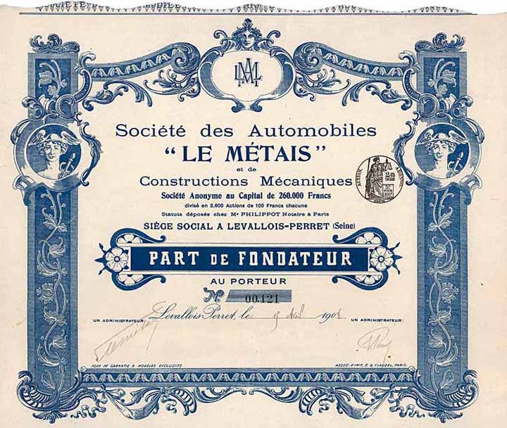 | Previous lot | Back | Next lot | | Lot: | 1453 (Cars) | | Title: | Soc. des Automobiles "Le Métais" et de Constructions Mécaniques S.A. | | Details: | Part de fondateur 19.4.1908. Gründeranteil. | Starting price: | 75,00 EUR | Issuing- date: | 19.04.1908 | Issuing- place: | Levallois-Perret | | Picture: |  | | Number: | 113 | | Info: | Gegründet 1904 durch Louis Le Métais und seine beiden Schwäger Henri und Émile Godefroy. Zunächst gab es Einzylindermodelle mit De Dion-Bouton-Einbaumotoren. Im Modell 9 CV wurde dann erstmals ein eigenentwickelter Motor verwendet. 1906-08 nahm Le Métais auch an Autorennen teil. Ab 1907 wurden Zwei- und Vierzylinder-Modelle mit Einbaumotoren von Gnome et Rhone gebaut. 1910 endete die Produktion | | Specials: | Sehr schöne Rankwerk-Umrandung, zwei Vignetten mit Hermes-Kopf. | | Availability: | Unentwertet, kpl. Kuponbogen anhängend. Äußerst selten. | | Condition: | EF-. | | Sold: | unsold |