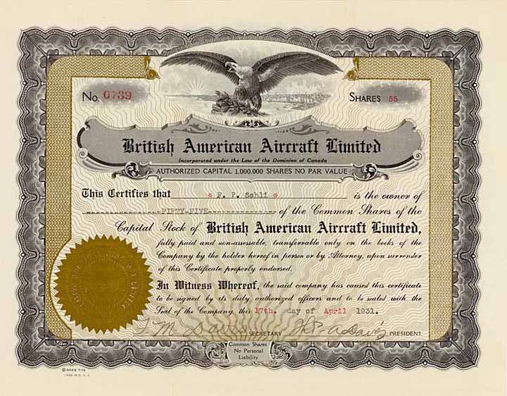 | Previous lot | Back | Next lot | | Lot: | 98 (Verschiedene Länder) | | Title: | British American Aircraft Ltd. | | Details: | 55 shares 17.4.1931. | Starting price: | 80,00 EUR | Issuing- date: | 17.04.1931 | | Picture: |  | | Number: | 739 | | Info: | Gegründet unter den Gesetzen von Kanada mit einem Kapital von 1 Mio. shares. | | Specials: | Herrliche Vignette mit Adler auf Steinen vor aufgehender Sonne und Stadtsilhouette am Wasser. Goldprägesiegel. | | Availability: | Unentwertet. | | Condition: | EF-VF. | | Sold: | 80,00 EUR |