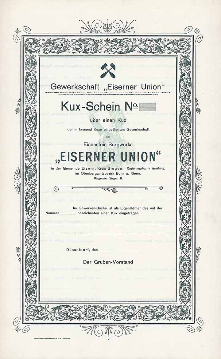 | Previous lot | Back | Next lot | | Lot: | 484 (Germany until 1945) | | Title: | Gewerkschaft “Eiserner Union“ | | Details: | Kux-Schein von 1899 (Blankette, R 10). | Starting price: | 50,00 EUR | Issuing- date: | 05.07.1899 | Issuing- place: | Düsseldorf | | Picture: |  | | Info: | Die Grube lag am westlichen Hang der Eisernhardt im oberen Hengsbachtal. 1801 wurde der Unionsstollen zur Wasserlösung der Gruben Friedensburg, Harteborn, Abendstern und Hinterste Sinternzeche angelegt. Beim Auffahren dieses Stollens traf man Brauneisenstein an, und 1869 kam aus dem Stollen eine höhere Erzförderung als aus jeder anderen Grube des Unionsgebietes. 1887 konsolidierten die verbliebenen Gruben im Unionsgebiet zur „Eiserner Union“, die bereits seit 1883 über den Morgenröther Stollen eine Anbindung an die Eisern-Siegener Eisenbahn nahe der Eiserner Hütte besaß. 1899 Verbund mit der benachbarten Grube Glücksbrunnen. 1916 übernahm die Deutsch-Luxemburgische Bergwerks- und Hütten-AG (Abt. Dortmunder Union) das Bergwerk mit seinen knapp 100 Mann Belegschaft, 1925 wurde es überraschend stillgelegt. | | Specials: | Sehr dekorativ, Bergmann in traditioneller Uniform im Unterdruck. | | Availability: | Doppelblatt. (R 10) | | Condition: | EF-VF. | | Sold: | 70,00 EUR |
