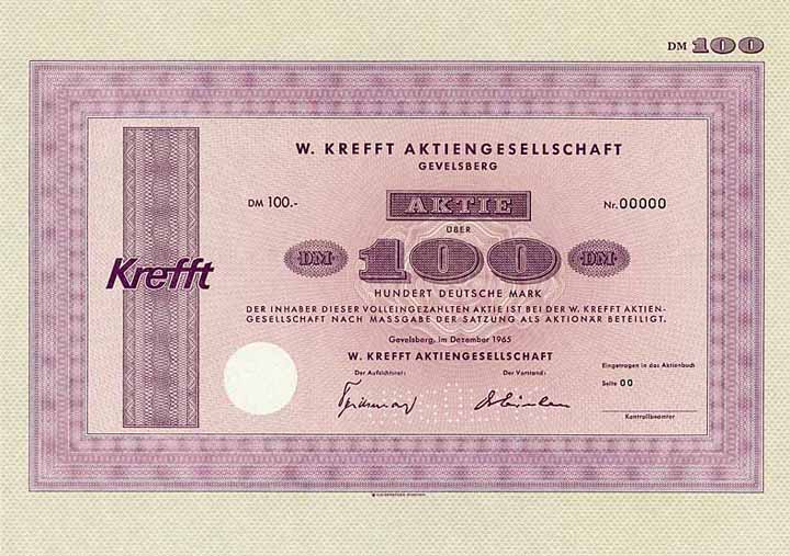 | Previous lot | Back | Next lot | | Lot: | 1299 (Deutschland 1948-Today (Die Deutsche Mark)) | | Title: | W. Krefft AG | | Details: | Aktie 100 DM Dez. 1965 (nullgeziffert, R 10). | Starting price: | 150,00 EUR | Issuing- date: | 01.12.1965 | Issuing- place: | Gevelsberg i.W. | | Picture: |  | | Info: | Gründung 1907 unter Übernahme der seit 1872 bestehenden “Gevelsberger Herdfabrik von W. Krefft” (die Vorgängerfirma Gottfried Krefft, eine Schlosserei mit Ladengeschäft für Herde und Öfen, bestand schon seit 1844). Herstellung und Vertrieb von Herden, Öfen, Koch- und Heizapparaten. 1919/20 Errichtung einer Waggonfabrik (1925 wieder stillgelegt, Umstellung auf große Giesserei). 1931 wurde mit dem Bau von Geschirrspülmaschinen und elektrischen Herden begonnen, später kamen Kühlschränke und Kühlanlagen dazu. 1946 begann die Produktion von Radio- und Fernsehgeräten (1955 wieder eingestellt). Die früher in Berlin börsennotierte AG - eine große Fabrik mit über 2.500 Mitarbeitern - wurde 1967 in die Krefft GmbH umgewandelt. | | Availability: | Ungültig-perforiert, mit Kuponbogen. (R 10) | | Condition: | UNC-EF. | | Sold: | 150,00 EUR |