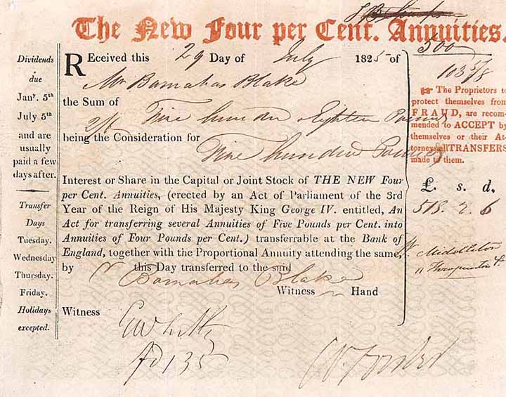 | Previous lot | Back | Next lot | | Lot: | 17 (Großbritannien) | | Title: | Englischer Staat - New Four per Cent Annuities | | Details: | 4 % Staatsanleihe 1.000 £ 29.8.1826. | Starting price: | 50,00 EUR | Issuing- date: | 29.07.1825 | Issuing- place: | London | | Picture: |  | | Info: | England ist das Land, das am frühesten zu einem wirklichen Staatskredit gelangte und die Formen der öffentlichen Schulden vor allen anderen Ländern ausgebildet hat. 1694 wurde die Bank von England gegründet. Die Gründung kam dadurch zustande, dass dem Staate von wenigen Gläubigern 1,2 Mio. £ als Kredit vorgestreckt wurden und der Staat den Gläubigern dafür Korporationsrechte verlieh. Dieser Kapitalbetrag von 1,2 Mio. £ bildete den Grundstock der Bank, an den sich im 18. Jh. weitere Schulden anlegten. Ihre Bedeutung erhielt die Bank damals als Verwalterin der englischen Staatsschulden. Diese Staatsschulden zerfielen in vier grosse Gruppen, wobei der Schwerpunkt für die Zeit bis 1914 auf den fundierten Schulden lag. Fundierte Schulden sind die ewigen Rentenschulden, die “Permanent Annuities”, die auch als Konsols bezeichnet wurden, die nicht getilgt wurden. Annuitätenschulden, Leib- und Zeitrenten, oder “Terminable Annuities” waren Tilgungsschulden. Andere Kapitalverbindlichkeiten, als “Sonstige Schuld” bezeichnet, waren reproduktive Tilgungsschulden. Schwebende oder unfundierte Schulden waren kurz- und mittelfristige Tilgungsschulden, wie z.B. Exchequer Bonds, Exchequer Bills und Treasury Bills. Die Aufnahme der fundierten Schulden stand im wesentlichen im Zusammenhang mit der Kriegsführung oder mit dem Unterhalt der Kolonien. | | Specials: | Vorliegende Annuity geht zurück auf "...Act of of Parliament of the 3rd Year of the reign of His Majesty King George IV. entitled, An Act for transferring several Annuities of Five Pounds per Cent into Annuities of Four Pounds per Cent“. Vordruck auf Büttenpapier, handschriftlich ergänzt, original signiert. | | Condition: | VF+. | | Sold: | 50,00 EUR |