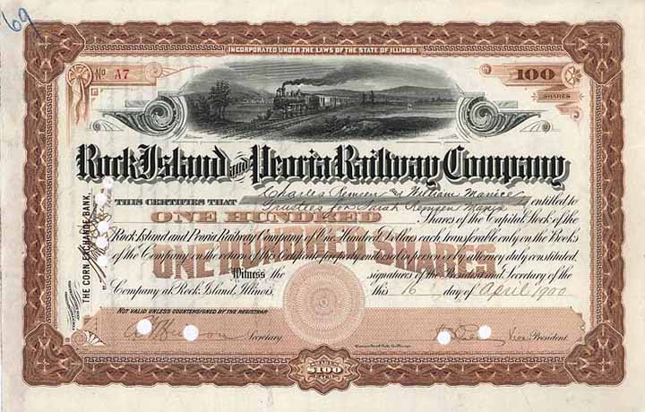 | Previous lot | Back | Next lot | | Lot: | 1904 (USA) | | Title: | Rock Island & Peoria Railway | | Details: | 100 shares à 100 $ 16.4.1900. | Starting price: | 100,00 EUR | Issuing- date: | 16.04.1900 | Issuing- place: | Rock Island, Ill. | | Picture: |  | | Number: | A6 | | Info: | Die Städte Peoria (am Illinois River) und Rock Island (am Upper Mississippi River) lagen beide an schiffbaren Wasserstraßen und ihr Frachtverkehr wurde problemlos mit Dampfschiffen abgewickelt. Allein, es gab keinen Binnenschifffahrtsweg zwischen beiden Städten (der erst 1907 mit dem Hennepin Canal geschaffen wurde), das schrie also nach einer Bahnverbindung. Die 91 Meilen lange Bahn wurde 1867-71 gebaut. Bald übernahm die mächtige Chicago, Rock Island & Pacific RR die Aktienmehrheit und gliederte sich die Bahn 1903 vollständig ein. Ihre Spezialisierung wurde ihr später zum Verhängnis: Amerikanischer Whisky wurde an der Jahrhundertwende überwiegend in Peoria gebrannt, und die P.&R.I. bediente die vielen Destillerien der Stadt mit Rohmaterial und Brennstoff. Die Einführung der Prohibition 1919 versetzte der Bahn einen Schlag, von dem sie sich nie wieder erholte. Ab 1963 wurde die Strecke schrittweise stillgelegt, ein knappes Drittel ist heute der Rock Island Trail. | | Specials: | Braun/schwarzer WBNC-Stahlstich, herrliche 14 cm breite Vignette mit Personenzug in weiter Landschaft. | | Availability: | Bei uns überhaupt noch nie versteigerte Variante. | | Condition: | EF-VF. | | Sold: | unsold |