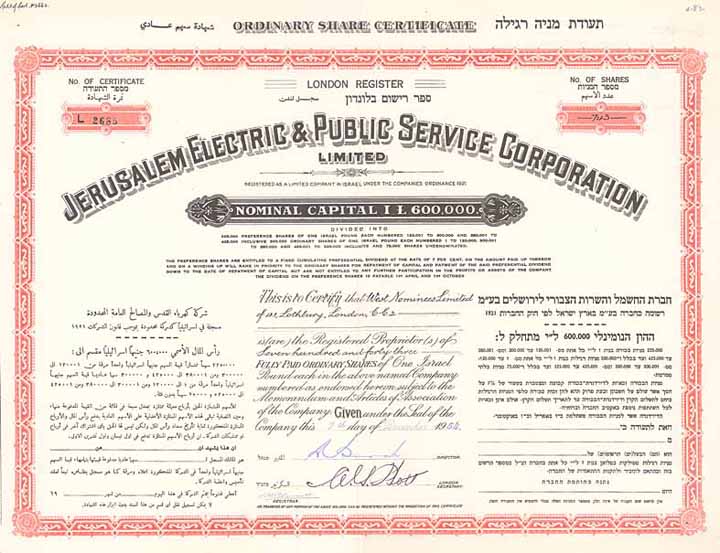 | Previous lot | Back | Next lot | | Lot: | 78 (Israel) | | Title: | Jerusalem Electric & Public Service Corp. | | Details: | 743 shares à 1 Israel £ 7.12.1954. | Starting price: | 60,00 EUR | Issuing- date: | 07.12.1954 | | Picture: |  | | Number: | 2685 | | Info: | Gründung 1928. Die Gesellschaft besaß das Recht, Jerusalem und die Umgebung in einer Reichweite von 480 Quadratmeilen bis zum Jahr 1972 mit Licht und Strom zu versorgen. Sie hatte ein Büro in Jaffa, Palestina und zwei in London. Die erste Stromgesellschaft in Palästina wurde gegründet von Euripidies Mavromatis, der 1914 vom ottomanischen Reich eine Konzession für die Produktion von Strom in Jerusalem erhielt. | | Specials: | Dreisprachig englisch, arabische und hebräische Schrift. Großformat mit schöner Umrandung. | | Condition: | EF. | | Sold: | 60,00 EUR |