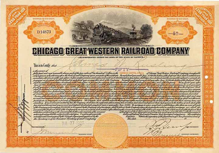 | Previous lot | Back | Next lot | | Lot: | 1683 (USA) | | Title: | Chicago Great Western Railroad | | Details: | 50 shares à 100 $ 27.7.1923. | Starting price: | 100,00 EUR | Issuing- date: | 27.07.1923 | Issuing- place: | Illinois | | Picture: |  | | Number: | D14873 | | Info: | Entstanden Anfang der 1880er als Chicago, St. Paul & Kansas City RR. Die 177 Meilen lange Strecke von St. Paul nach Lyle an der Iowa-Staatsgrenze war Keimzelle eines der später wichtigsten Bindeglieder zwischen den nach Chicago führenden Bahnen des Ostens und den Bahnen westlich des Mississippi. Knotenpunkt der Bahn mit einer eigenen Lokomotivfabrik, einer Beeisungsanlage für Kühlzüge und einem Rangierbahnhof mit über 30 Gleisen war Oelwein in Iowa, wo sich die Nord-Süd-Strecke von St. Paul nach Kansas City und die von Chicago kommende Ost-West-Strecke kreuzten (Gesamtstreckenlänge 1.475 Meilen). 1892 umfirmiert in Chicago Great Western Railway. Nach der Insolvenz 1908 Übernahme durch J. P. Morgan und im Jahr darauf Reorganisation als Chicago Great Western Railroad. Pionierleistungen der Bahn waren bereits 1936 (!) die Einführung von Trailer-Truck-Trains (Sattelschlepperauflieger auf Flachwagen), 1939 die Einführung lückenlos verschweißter Schienen sowie ab 1954 die Bildung extrem langer Güterzüge mit 250 vierachsigen Güterwagen, die von sechs bis acht Dieselloks gezogen wurden. 1968 Fusion mit der Chicago & North Western Ry., 1995 schließlich in der Union Pacific aufgegangen. | | Specials: | Orange/schwarzer ABNC-Stahlstich, große und ungemein detailreiche Vignette mit Fahrgästen auf dem Bahnsteig, davor zwei sich kreuzende Eilzüge. | | Availability: | Die älteste überhaupt bekannte Aktie der CGW als Railroad! Unentwertet. Bereits bei der Fusion 1968 vergaß man dieses Stück sowie auch das folgende 10er-Stück zum Umtausch einzureichen, deshalb ganz extrem selten. | | Condition: | EF-VF. | | Sold: | 110,00 EUR |