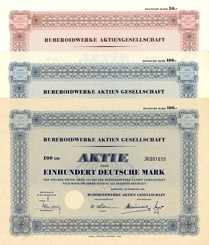 | Previous lot | Back | Next lot | | Lot: | 1608 (Deutschland 1948-Today (Die Deutsche Mark)) | | Title: | Ruberoidwerke AG (3 Stücke) | | Details: | Aktien 100 DM Febr. 1952, #1899; 100 DM Dez. 1960, #3492 + 50 DM Juli 1974, #50263. | Starting price: | 80,00 EUR | Issuing- place: | Hamburg | | Picture: |  | | Info: | Gegründet wurde das Ruberoidwerk 1897 in Hamburg-Billbrook, umgewandelt in eine GmbH 1906 und in eine AG 1914. Ausgehend von der Dachpappen-Herstellung entstand im Laufe der Jahrzehnte ein breitgefächertes Lieferprogramm von Dach- und Dichtungsbahnen, Ruberstein-Wand- und Fassadenplatten, Rubadur-Fassadenplatten, Haft- und Mörtelzusätzen, Flüssigestrichen sowie Spezialbandagen. Außerdem wurden im eigenen Baubetrieb Flachdach-, Grundwasser- und Feuchtigkeitsabdichtungen selbst ausgeführt. Bald war das Unternehmen deutschlandweit ebenso wie international tätig. Die Betriebe in Posen und Spremberg gingen als Folge des 2. Weltkrieges verloren. Dafür entstand in Westdeutschland ein dicht gespanntes Netz von 17 Niederlassungen in allen größeren Städten, Auslandsvertretungen arbeiteten in Dänemark, Frankreich, Österreich, Spanien und den Benelux-Ländern, aber auch in Chile, Venezuela, Japan und im Iran. Neben der Joh. Heinrich Warncke GmbH, Pinneberg (über 25 %) war jahrzehntelang die Rütgerswerke AG mehrheitlich beteiligt. Zuletzt erscheint mit 71,44 % die Billbrook GbR als Großaktionär. 1993 in Ruberoid AG umfirmiert. Scharfen Absatzeinbrüchen 1997/98 folgte dann 2000 die Insolvenz. | | Availability: | Alle unentwertet. | | Condition: | UNC-EF. | | Sold: | 80,00 EUR |