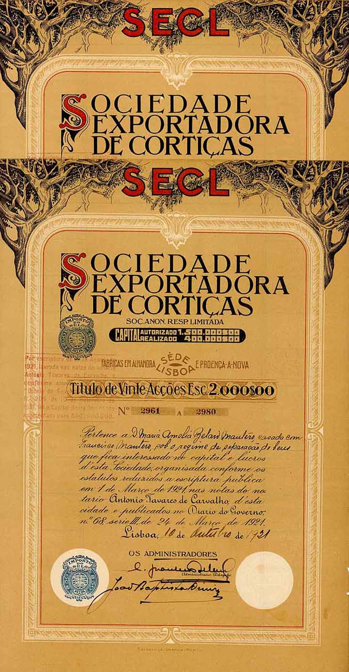 | Previous lot | Back | Next lot | | Lot: | 436 (Wine) | | Title: | Sociedade Exportadora de Corticas (2 Stücke) | | Details: | Accoes 5 x 100$00 + 20 x 100$00 Esc. 10.10.1921 (Gründeraktien). | Starting price: | 80,00 EUR | Issuing- place: | Lissabon | | Picture: |  | | Info: | Die 1921 gegründete Gesellschaft exportierte Kork. Die Fabriken waren in Alhandra und Proenca a Nova. | | Specials: | Sehr dekorativ mit Korkeichen. | | Condition: | EF-. | | Sold: | unsold |