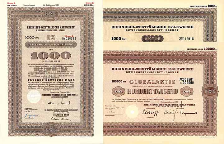 | Previous lot | Back | Next lot | | Lot: | 1170 (Deutschland 1948-Today (Die Deutsche Mark)) | | Title: | Rheinisch-Westfälische Kalkwerke AG (8 Stücke) | | Details: | Wertpapiere von 1955 bis 1963. | Starting price: | 150,00 EUR | Issuing- place: | Dornap | | Picture: |  | | Info: | Gründung 1887 als "Dornap-Angerthaler AG für Kalkstein- und Kalkindustrie", 1888 umbenannt wie oben. Ausbeutung von Kalkstein- und Dolomitfeldern im ganzen niederrheinisch-westfälischen Industriegebiet. Die Steinbrüche in Dornap, Hochdahl, Neanderthal, Gruiten, Elberfeld, Wülfrath, Barmen-Rittershausen, Hofermühle, Ober-Hagen, Letmathe und Hönnethal waren durch fast 30 km lange normal- und schmalspurige Werkseisenbahnen verbunden. Beliefert wurden vor allem die niederrheinisch-westfälischen Eisen- und Stahlwerke mit Hüttenkalk, folgerichtig wurde die RWK in den 30er Jahren Teil der Vereinigten Stahlwerke. Nach Beschlagnahme durch die Alliierten wurde das Betriebsvermögen bei Entflechtung der Vereinigte Stahlwerke 1953 auf eine neu gegründete AG gleichen Namens übertragen. Maßgebliche Aktionäre waren dann lange Zeit die Stahlwerke an der Ruhr als Hauptabnehmer (zuletzt die Hoesch-Werke AG mit über 75 %), heute gehört die 1999 in RWK Kalk AG umbenannte Ges. zum britischen Baustoffkonzern Readymix. | | Specials: | Aktien 100 DM (Blankette), 1.000 DM, #16918 + 100 x 1.000 DM, #9501-600 Aug. 1955; 100 DM, #32210, 1.000 DM, #19007 + 100 x 1.000 DM, #29801-900 Juli 1957; 6 % Teilschuldv. 100 DM, #9280 + 1.000 DM, #28332 Febr. 1963. | | Condition: | UNC-EF. | | Sold: | 150,00 EUR |