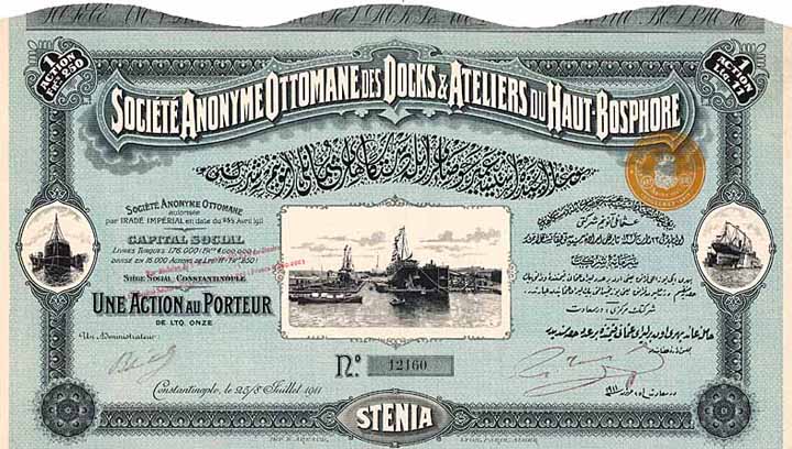 | Previous lot | Back | Next lot | | Lot: | 370 (Türkei / Ottomanisches Reich) | | Title: | S.A. Ottomane des Docks & Ateliers du Haut-Bosphore | | Details: | Action 11 £ tq. = 250 F 25./8.7.1911. Gründeraktie (Auflage 16000, TR 1300a, R9). | Starting price: | 40,00 EUR | Issuing- date: | 25.07.1911 | Issuing- place: | Constantinople | | Picture: |  | | Number: | 12148 | | Info: | Gründung 1911. Bau von Kais, Errichtung von drei Trockendocks und einer Werft sowie von Schiffreparaturwerkstätten in Sténia. | | Specials: | Äußerst dekorativ, drei Vignetten mit Werft und Trockendocks. Zweisprachig französisch/arabisch. | | Availability: | Anh. Kupons. | | Condition: | EF-VF. | | Sold: | unsold |