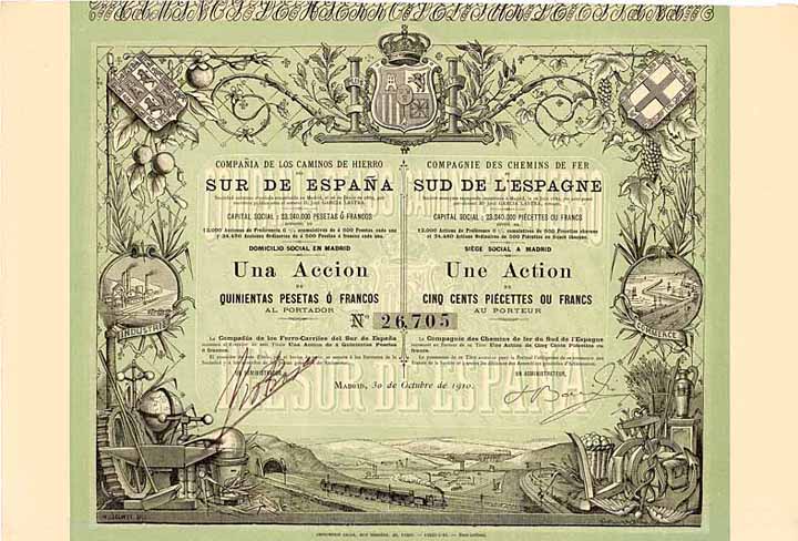 | Previous lot | Back | Next lot | | Lot: | 309 (Spanien) | | Title: | Cia. de los Caminos de Hierro del Sur de España S.A. | | Details: | Accion 500 ptas = 500 F 30.10.1910 (Auflage 8840). | Starting price: | 100,00 EUR | Issuing- date: | 30.10.1910 | Issuing- place: | Madrid | | Picture: |  | | Number: | 26705 | | Info: | Bereits 1870 war die Konzession für den Bau einer Bahn von der Bergbaustadt Linares im Osten Andalusiens zur Hafenstadt Almería erteilt worden, doch nichts passierte. Inzwischen war Almería die letzte spanische Provinzhauptstadt ohne Bahnanschluß, als 1889 diese mit einer neuen Konzession ausgestattete Ges. gegründet wurde. Der Bau der 251 km langen überwiegend mit französchem Kapital finanzierten Bahn dauerte fast 10 Jahre bis 1899. Die Streckenführung orientierte sich nicht an Ortschaften, sondern an den Bedürfnissen der Eisenerzbergwerke und der Stahlindustrie als Güterverkehrskunden (weshalb Städte wie Baeza, Úbeda und Jódar gar nicht berührt werden). Zwischen Gérgal und Santa Fe bereitete das starke Gefälle den schweren Güterzügen erhebliche Probleme, weshalb dieser Abschnitt 1912 als eine der ersten Strecken in ganz Spanien elektrifiziert wurde. 1897-1904 wurde zudem der Abzweig Moreda-Granada gebaut; in Granada endete die Südbahn in einem eigenen Bahnhof, der erst 1907 mit dem Bahnhof der F.C. Andaluces verbunden wurde. Die Defizite der Sur de Espana wurden immer nur größer, nicht einmal ihre Anleihezinsen konnte sie zahlen. 1916 zunächst an die Ferrocarriles Andaluces verpachtet und 1929 dann komplett in diese integriert wurde. 1941 wie alle spanischen Bahnen in der staatlichen RENFE aufgegangen. Die bis heute nur eingleisige und nicht (mehr) elektrifizierte Strecke wird jetzt im Personenverkehr von Talgo-Gliederzügen befahren. | | Specials: | Zweisprachig spanisch/französisch. Hochdekorativ mit Wappen, Eisenbahn, Allegorien sowie Darstellungen von Industrie und Handel in der reich verzierten Umrahmung. | | Availability: | Unentwertet, kpl. Kuponbogen anhängend. | | Condition: | UNC-EF. | | Sold: | unsold |