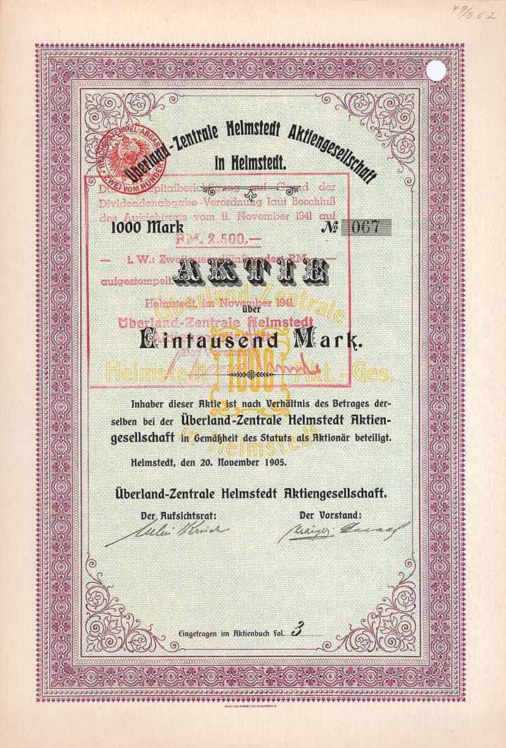 | Previous lot | Back | Next lot | | Lot: | 919 (Germany until 1945) | | Title: | Überland-Zentrale Helmstedt AG | | Details: | Aktie 1.000 Mark 20.11.1905. Gründeraktie (Auflage 150, R 5). | Starting price: | 85,00 EUR | Issuing- date: | 20.11.1905 | Issuing- place: | Helmstedt | | Picture: |  | | Number: | 11 | | Info: | Kurz nach der Gründung 1905 wurde ein kleines Kraftwerk im Bereich der Braunkohlengrube Emma bei Emmerstedt errichtet. 1912 kam mit einem Schlag die große Expansion: Abschluß eines Stromlieferungsvertrages mit dem Landkreis Braunschweig (später Überlandwerk Braunschweig GmbH) zwecks Versorgung des gesamten Landkreises Braunschweig und der östlichen Teile des Kreises Wolfenbüttel, Erwerb der Elektrizitätswerk Ringelheim GmbH und schließlich Übernahme des Versorgungsnetzes in den Kreisen Goslar und Wolfenbüttel von der Bergmann-Elektrizitäts-Unternehmungen AG in Berlin. 1913 erwarb die Braunschweigische Kohlenbergwerke AG (BKB) in Helmstedt sämtliche ÜZH-Aktien. 1921 Übernahme des Kraftwerkes Schöningen und des Versorgungsgebietes der ehem. Braunschweigischen Elektrizitäts-Betriebsges. mbH in Schöningen (das Kraftwerk wurde 1940 zwecks klarer Trennung von Stromerzeugung und Stromverteilung an die Mutter BKB veräußert). 1999 Fusion mit der WEVG (Wasser- und Energieversorgung Salzgitter) u.a. zur heutigen AVACON AG, deren Hauptaktionär mittelbar die E.ON Energie AG in München ist. Mit rd. 2.700 Mitarbeitern werden heute in Niedersachsen und Sachsen-Anhalt 1,3 Mio. Kunden mit Strom, Gas, Fernwärme und Wasser versorgt. | | Specials: | Originalsignatur von Julius Krisch als Aufsichtsratsvorsitzender. Krisch, vom Beruf Bergingenieur, 1892-1912 Direktor der Braunschweigischen Kohlenbergwerke, arbeitete als Sachverständiger für mehrere Braunkohlengesellschaften. Lochentwertet (RB). | | Availability: | Doppelblatt. (R 5) | | Condition: | EF. | | Sold: | unsold |