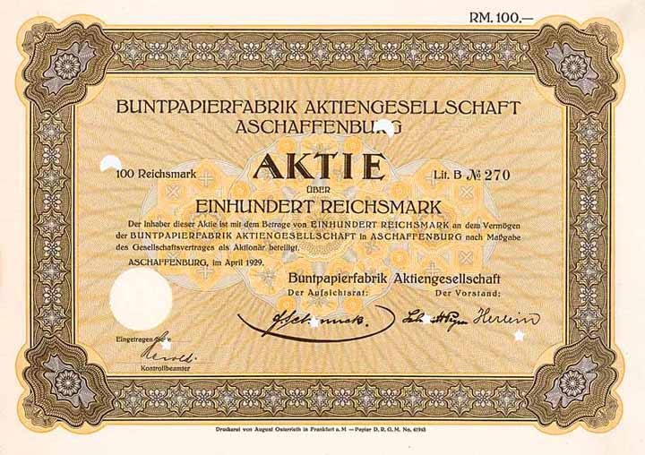 | Previous lot | Back | Next lot | | Lot: | 1480 (Deutschland 1924-1945 (III. Reich)) | | Title: | Buntpapierfabrik AG | | Details: | Aktie Lit. B 100 RM April 1929 (Auflage 2000). | Starting price: | 80,00 EUR | Issuing- date: | 01.04.1929 | Issuing- place: | Aschaffenburg | | Picture: |  | | Number: | 270 | | Info: | Gründung 1810, AG seit 1859. Herstellung von Kunstdruck-, Chromo- und Korrosionsschutz-Papieren, einbrennbaren Abziehbildern für die keramische Industrie. Weltweit ältestes und damals größtes Unternehmen seiner Branche. | | Availability: | Einzelstück aus einer uralten süddeutschen Sammlung, bisher unbekannte Stückelung. | | Condition: | Lochentwertet. Mit restlichem Kuponbogen. EF+. | | Sold: | 145,00 EUR |