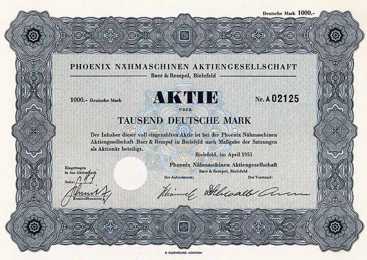 | Previous lot | Back | Next lot | | Lot: | 1727 (Deutschland 1948-2000 (Die Deutsche Mark)) | | Title: | Phoenix Nähmaschinen AG Baer & Rempel | | Details: | Aktie 1.000 DM April 1951 (Auflage 3500). | Starting price: | 40,00 EUR | Issuing- date: | 01.04.1951 | Issuing- place: | Bielefeld | | Picture: |  | | Number: | 2530 | | Info: | Gründung 1865 als oHG Bielefelder Nähmaschinenfabrik Baer & Rempel, 1934 umgewandelt in die obige AG. 1958 gründen die Bielefelder Anker-Werke AG die Nähmaschinenproduktion in die Anker-Nähmaschinen AG aus, übernehmen die Mehrheit der Phoenix-Nähmaschinen AG und fusionieren beide Unternehmen 1959 zur Anker-Phoenix Nähmaschinen AG. | | Condition: | UNC. | | Sold: | 40,00 EUR |