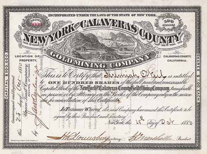 | Previous lot | Back | Next lot | | Lot: | 77 (U.S.A.) | | Title: | New York and Calaveras County Gold Mining | | Details: | 100 shares à 1 $ 28.10.1880. | Starting price: | 135,00 EUR | Issuing- date: | 28.10.1880 | Issuing- place: | New York | | Picture: |  | | Number: | 5009 | | Info: | Goldminen im kalifornischen Calaveras County. | | Specials: | Schöne Vignette mit Übertageanlagen der Bergwerke. | | Condition: | Unentwertet. EF-VF. | | Sold: | 135,00 EUR |
