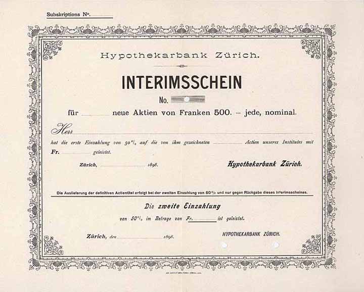 | Previous lot | Back | Next lot | | Lot: | 521 (Schweiz) | | Title: | Hypothekarbank Zürich | | Details: | Interimsschein 500 Fr. von 1898 (Muster). | Starting price: | 90,00 EUR | Issuing- date: | 01.01.1898 | Issuing- place: | Zürich | | Picture: |  | | Specials: | Die erste Einzahlung erfolgte mit 50 %, die zweite ebenfalls, dann wurde der definitive Actientitel ausgeliefert. Belegstück aus dem Druckarchiv der Druckerei Orell Füssli, Zürich. | | Availability: | Äußerst selten. | | Condition: | Lochentwertet. EF-VF. | | Sold: | unsold |