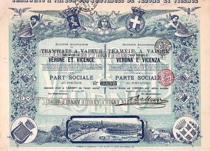 | Previous lot | Back | Next lot | | Lot: | 342 (Italien) | | Title: | S.A. di Tramvie a Vapore delle Provincie di Verona e Vicenza | | Details: | Parte Sociale vom 10.7.1905. | Starting price: | 75,00 EUR | Issuing- date: | 10.07.1905 | Issuing- place: | Brüssel | | Picture: |  | | Number: | 2875 | | Info: | Gründung 1881 zum Betrieb von Straßen- und Kleinbahnen in den beiden oberitalienischen Provinzen. | | Specials: | Hochdekorativ, Vignette mit Stadtansicht und dem großen Kollosseum von Verona. Zweisprachig französisch/italienisch. Hochdekorativ. | | Availability: | Äußerst selten. | | Condition: | VF. | | Sold: | 80,00 EUR |