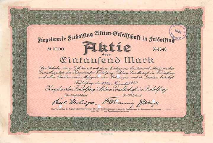 | Previous lot | Back | Next lot | | Lot: | 1334 (Deutschland 1919-1923 (Die Inflation)) | | Title: | Ziegelwerke Fridolfing AG | | Details: | Aktie 1.000 Mark 27.11.1922. Gründeraktie (Auflage 7000). | Starting price: | 140,00 EUR | Issuing- date: | 27.11.1922 | Issuing- place: | Fridolfing | | Picture: |  | | Number: | 4646 | | Info: | Gründung 1922. Herstellung und Vertrieb von Ziegeln und Tonwaren aller Art. 1937 Umwandlung der AG in eine KG durch Vermögens-Übertragung ohne Liquidation auf die Ziegelwerke Fridolfing Nachflg. Heinrich Lechner & Co. KG. | | Availability: | Extrem selten. | | Condition: | 6fach lochentwertet. VF. | | Sold: | unsold |