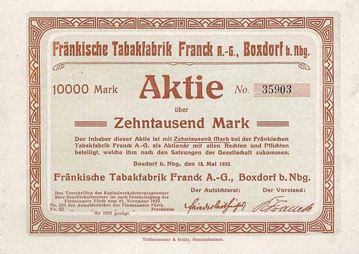 | Previous lot | Back | Next lot | | Lot: | 1203 (Deutschland 1919-1923 (Die Inflation)) | | Title: | Fränkische Tabakfabrik Franck AG | | Details: | Aktie 10.000 Mark 12.5.1923. Gründeraktie (Auflage 42000). | Starting price: | 150,00 EUR | Issuing- date: | 12.05.1923 | Issuing- place: | Boxdorf b. Nbg. | | Picture: |  | | Number: | 38696 | | Info: | Die Firma stellte Tabakwaren aller Art her, außerdem Handel mit Tabakrohmaterialien. Schon ein Jahr nach der Gründung im Handelsregister wieder gelöscht. | | Specials: | Jugendstilumrandung. | | Availability: | Nur 3 Stücke sind seit vielen Jahren bekannt. | | Condition: | Mit kpl. Kuponbogen. EF. | | Sold: | 150,00 EUR n |