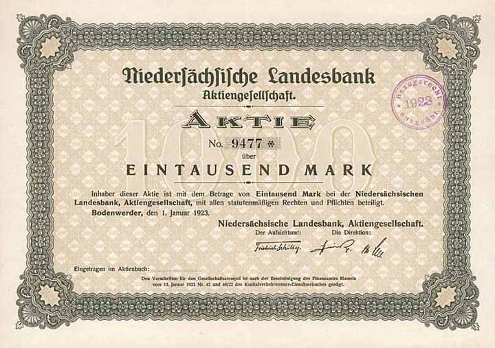 | Previous lot | Back | Next lot | | Lot: | 1259 (Deutschland 1919-1923 (Die Inflation)) | | Title: | Niedersächsische Landesbank AG | | Details: | Aktie 1.000 Mark 1.1.1923. | Starting price: | 80,00 EUR | Issuing- date: | 01.01.1923 | Issuing- place: | Bodenwerder | | Picture: |  | | Number: | 14115 | | Info: | Gründung 1910 in Polle, Zweigstellen in Hameln und Emmerthal. 1924 Konkurs. | | Condition: | Mit kpl. Kuponbogen. EF. | | Sold: | unsold |