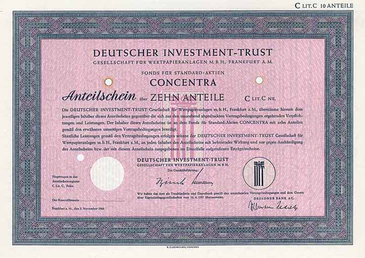 | Previous lot | Back | Next lot | | Lot: | 1640 (Deutschland 1948-2000 (Die Deutsche Mark)) | | Title: | Deutscher Investment-Trust Gesellschaft für Wertpapieranlagen m.b.H. | | Details: | Anteilschein Lit. C für 10 Concentra-Anteile 3.11.1960 (Blankette). | Starting price: | 65,00 EUR | Issuing- date: | 03.11.1960 | Issuing- place: | Frankfurt | | Picture: |  | | Info: | Seit 1955 betreibt der dit Vermögensverwaltung (Asset Management) für private Anleger in Deutschland. Früher Tochter der Dresdner Bank heute als Teil der Allinanz Dresdner Global Investors zu den fünf größten und finanzstärksten Asset Manager der Welt gehörend. | | Specials: | Hübscher Druck mit DIT-Emblem im Unterdruck und Prägesigel. | | Condition: | Lochentwertung. UNC-EF. | | Sold: | unsold |