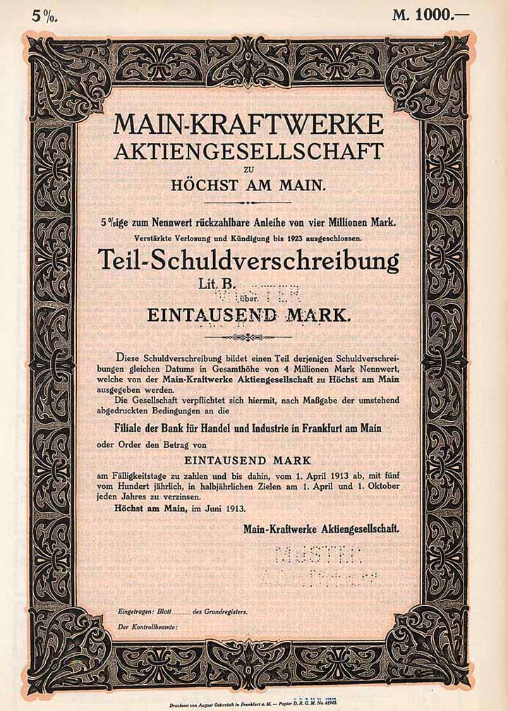 | Previous lot | Back | Next lot | | Lot: | 1184 (Deutschland 1875-1918 (Die Kaiserzeit)) | | Title: | Main-Kraftwerke AG | | Details: | 5 % Teilschuldv. 1.000 Mark Juni 1913 (Muster). | Starting price: | 150,00 EUR | Issuing- date: | 01.06.1913 | Issuing- place: | Höchst am Main | | Picture: |  | | Info: | Gründung 1911. Hauptgründer waren die "Felten und Guilleaume-Lahmeyerwerke AG", Köln und die "Elektrizitäts-AG vorm. W. Lahmeyer & Co.", Frankfurt nach dem bewährten Muster, dass durch Gründung von Kraftwerksbetrieben die eigenen elektrotechnischen Erzeugnisse mehr Absatz fanden. Später kam (der noch heutige) Großaktionär RWE dazu. Die Gesellschaft belieferte in der sehr industriereichen Umgebung Frankfurts fast 400 Gemeinden mit über 300.000 Einwohnern mit Energie. Börsennotiz Frankfurt. | | Specials: | Aus der Druckerei von August Osterrieth in Frankfurt a.M. | | Availability: | Einzelstück aus der Hesselmann-Sammlung. | | Condition: | Muster-Perforation, EF. | | Sold: | 160,00 EUR |