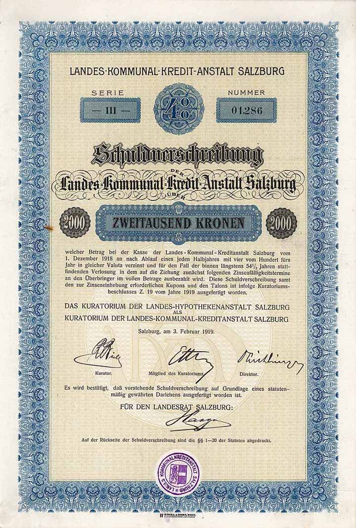| Previous lot | Back | Next lot | | Lot: | 782 (k.u.k Monarchie / Nachfolgestaaten) | | Title: | Landes-Kommunal-Kredit-Anstalt Salzburg | | Details: | 4 % Schuldv. 2.000 Kr. 3.2.1919. | Starting price: | 25,00 EUR | Issuing- date: | 03.02.1919 | Issuing- place: | Salzburg | | Picture: |  | | Number: | 1286 | | Specials: | Schöner großformatiger Titel, Jugendstilelemente im Unterdruck. | | Condition: | Doppelblatt. EF. | | Sold: | unsold |
