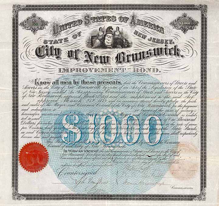 | Previous lot | Back | Next lot | | Lot: | 66 (U.S.A.) | | Title: | City of New Brunswick | | Details: | 7 % Improvement Bond 1.000 $ 1.11.1877. | Starting price: | 50,00 EUR | Issuing- date: | 01.11.1877 | Issuing- place: | New Jersey | | Picture: |  | | Number: | 349 | | Specials: | Anleihe zum Bau von Straßen und Entwässerungskanälen. Großes Querformat, blau/schwarzer Druck mit allegorischer Vignette. | | Condition: | Rechts unten fehlende Ecke, unterer Rand unegal durch Kupontrennung. VF. | | Sold: | unsold |