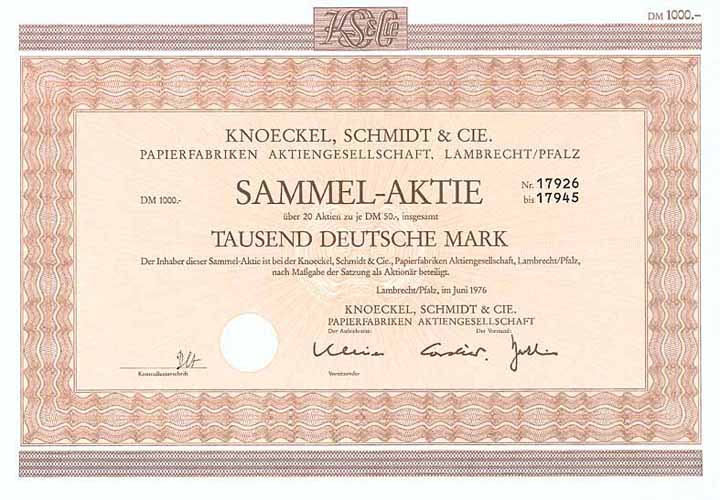 | Previous lot | Back | Next lot | | Lot: | 1737 (Deutschland 1948-2000 (Die Deutsche Mark)) | | Title: | Knoeckel, Schmidt & Cie. Papierfabriken AG | | Details: | Sammel-Aktie 20 x 50 DM Juni 1976. | Starting price: | 60,00 EUR | Issuing- date: | 01.06.1976 | Issuing- place: | Lambrecht/Pfalz | | Picture: |  | | Number: | 18926-45 | | Info: | Gründung am 29.1.1923 durch Übernahme der Firma Knoeckel, Schmidt & Cie GmbH in Lambrecht. Die Rechtsvorgängerin wurde 1888 gegründet. 1945/46 Teilweise Stilllegung infolge von Rohstoff- und Kohlenmangel. Das Unternehmen erlitt jedoch keinerlei Kriegsschäden. Hauptsächlich Erzeugung von Pergamynpapieren, transparenten Pauspapieren sowie Wachsroh- und technischen Spezialpapieren. Das Unternehmen besaß einen eigenen Gleisanschluss. Hauptaktionär war die Robert Cordier GmbH. Heute Areal Immobilien und Beteiligungs-AG. | | Condition: | Entwertet, mit Kupons. UNC. | | Sold: | 78,00 EUR |