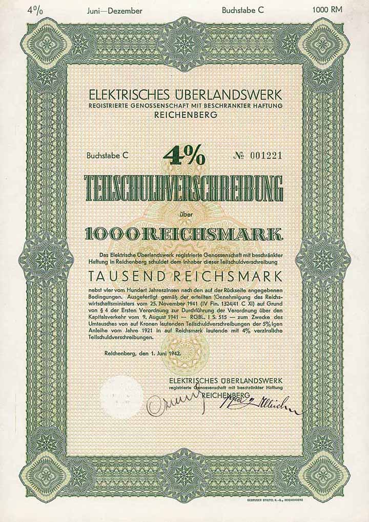 | Previous lot | Back | Next lot | | Lot: | 1474 (Deutschland 1924-1945 (III. Reich)) | | Title: | Elektrisches Überlandswerk rGmbH | | Details: | 4 % Teilschuldv. 1.000 RM 1.6.1942 (Auflage 700). | Starting price: | 25,00 EUR | Issuing- date: | 01.06.1942 | Issuing- place: | Reichenberg | | Picture: |  | | Number: | 1223 | | Info: | 1935 Firma umbenannt zu Elektrizitätswerk und Überlandzentrale Mühlhausen i.Th. GmbH. | | Condition: | Mit Kupons. EF. | | Sold: | 25,00 EUR |