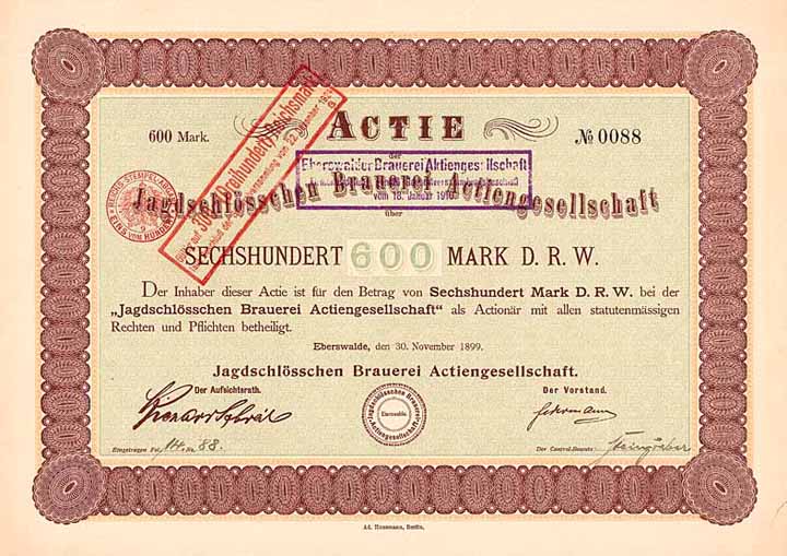 | Previous lot | Back | Next lot | | Lot: | 1171 (Deutschland 1875-1918 (Die Kaiserzeit)) | | Title: | Jagdschlösschen Brauerei AG | | Details: | Actie 600 Mark 30.11.1899 (Auflage 600). | Starting price: | 120,00 EUR | Issuing- date: | 30.11.1899 | Issuing- place: | Eberswalde | | Picture: |  | | Number: | 309 | | Info: | Gründung 1872 als "Märkische Gewerbebank". Wohl unter dem Oberbegriff "Liquidität" wandte sich die Bank 1898 dem Biergeschäft zu. 1906-1910 Eberswalder Brauerei AG vorm. Jagdschlösschen-Schiele, ab 1910 Eberswalder Brauerei AG. Alleinaktionär war zuletzt die Schultheiss-Brauerei. | | Condition: | EF. | | Sold: | unsold |