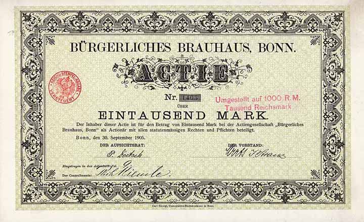 | Previous lot | Back | Next lot | | Lot: | 1106 (Deutschland 1875-1918 (Die Kaiserzeit)) | | Title: | Bürgerliches Brauhaus | | Details: | Aktie 1.000 Mark 30.9.1905 (Auflage 200). | Starting price: | 150,00 EUR | Issuing- date: | 30.09.1905 | Issuing- place: | Bonn | | Picture: |  | | Number: | 1465 | | Info: | In der 1897 gegründeten AG gingen die Brauerei zum Bären Franz Josef Gervers Nachf., die Adler-Brauerei Otto Wolter und die Brauerei Herm. Aug. Wirts auf. Die Braustätte lag in der Bornheimer Straße 42. 1950 Umfirmierung in Kurfürsten-Bräu AG. Nach und nach erwarb die Dortmunder Union-Brauerei über 98 % der Aktien. 1990 im Großaktionär Brau und Brunnen AG aufgegangen und noch für ganz kurze Zeit unter dem alten Namen als Grundstücksgesellschaft fortgeführt. | | Specials: | Schöne Ornament-Umrahmung, mit Originalunterschriften. | | Condition: | Doppelblatt. EF. | | Sold: | 160,00 EUR |