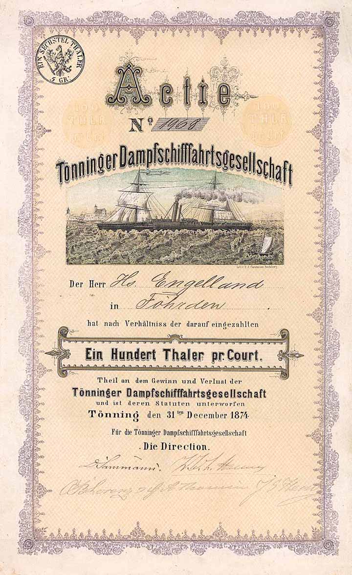 | Previous lot | Back | Next lot | | Lot: | 1088 (Deutschland 1870-1874 (Die Gründerzeit)) | | Title: | Tönninger Dampfschifffahrtsgesellschaft | | Details: | Actie 100 Thaler 31.12.1874 (Auflage 2000). | Starting price: | 2.800,00 EUR | Issuing- date: | 31.12.1874 | Issuing- place: | Tönning | | Picture: |  | | Number: | 2617 | | Info: | Die Stadt Tönning an der Eidermündung hatte damals knapp 3000 Einwohner. Die starke Orientierung auf den Außenhandel unterstrich das Vorhandensein eines englischen und eines niederländischen Konsulats. Insbesondere der England-Handel florierte. Der Export von Fettvieh und der Import englischer Kohle war der Haupterwerbszweig der Stadt. Für den Transport dieser Güter wurde die Tönninger Dampfschifffahrtsgesellschaft von am Außenhandel interessierten Kaufleuten gegründet. | | Specials: | Äußerst dekoratives Stück, mehrfarbiger Druck, teilweise in Gold, mit Originalunterschriften. | | Availability: | Äußerst selten. | | Condition: | VF. | | Sold: | 2.800,00 EUR n |